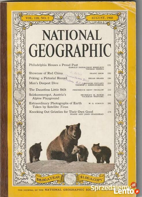 Czasopismo jest po angielsku,lekko podniszczona okladka. VOL. 118, NO. 2 AUGUST, 1960 NATIONAL GEOGRAPHIC Philadelphia Houses a Proud Past 9 Showcase of Red China Peking: a Pictorial Record Man's Deepest Dive 151 HAROLD DONALDSON EBERLEIN THOMAS NEBBIA FRANC SHOR 192 BRIAN BRAKE 194 224 Eolcal Queensthorpe Road Ondon, 8. H. JACQUES PICCARIE The Dauntless Little Stilt Salzkammergut, Austria's Alpine Playground THOMAS J. ABERCROMBIE FREDERICK KENT TRUSLOW 240 BEVERLEY M. BOWIE VOLKMAR WENTZEL 246 Extraordinary Photographs of Earth Taken by Satellite Tiros G. STROUD 292 Knocking Out Grizzlies for Their Own Good 276 FRANK AND JOHN CRAIGHEAD THE JOURNAL OF THE NATIONAL GEOGRAPHIC SOCIETY WASHINGTON, D. C. Karton 89 Ogłoszenie jest aktualne dopóki znajduje się na stronie . Odbiór osobisty lub wysyłkaSprawdź zainteresowanie tym ogłoszeniem