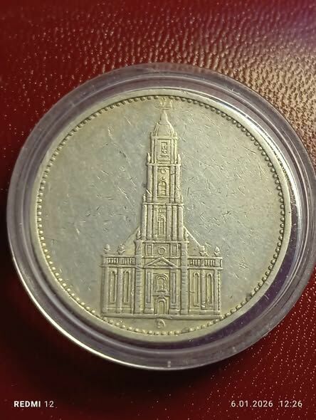 Niemcy III Rzesza - 5 Marek 1934- D - Kościół Garnizonowy -Data - III Rzesza Niemiecka ,moneta pamiątkowa , srebro Ag900 ,sr.29mm ,waga 14gr ,stan zachowania widoczny na zdjęciach .Polecam do kolekcji .