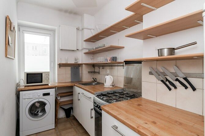 Kuchnia: lodówka, kuchenka gazowa, pralka, mikrofalówka, zlew, okap,