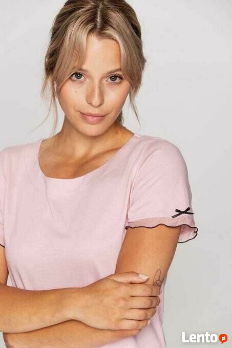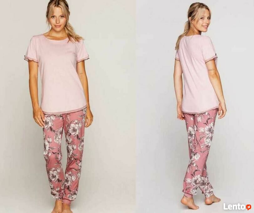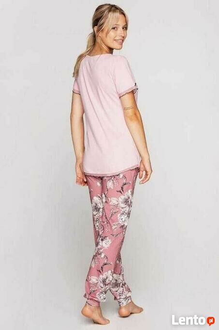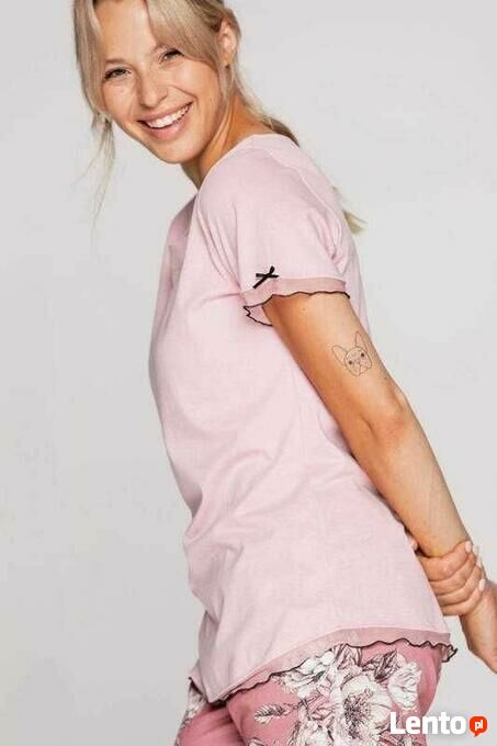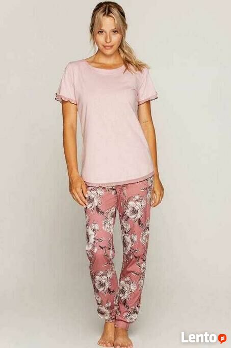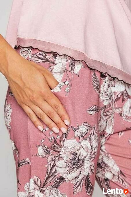 Producent: CANAUrocza damska piżama 691 wykonana z miękkiej i przyjemnej dla ciała bawełny. Bladoróżowa koszulka o klasycznym kroju z krótkimi rękawami ozdobionymi czarnymi kokardkami. Dekolt półokrągły. Rękawy i dół bluzy z ażurową, delikatną siateczką wykończoną czarną mereszką. Spodnie z długim nogawkiem, pokryte przepięknym printem w barokowe róże. Na wysokości bioder praktyczne kieszenie. Nogawki zakończone komfortowym ściągaczem.
