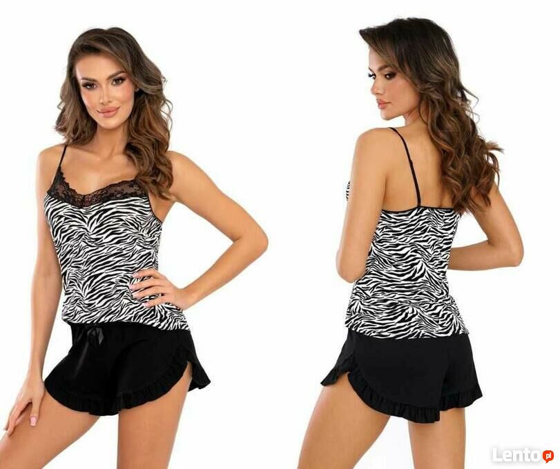 Producent: DONNAEgzotyczny komplet ZEBRA przeniesie Cię wprost na gorące safari! Biało-czarna koszulka ozdobiona drapieżnym, zwierzęcym printem. Cienkie ramiączka z możliwością regulacji, nieodpinane. Dekolt niezbyt głęboki ozdobiony elegancką koronką. Czarne spodenki wykończone w pasie wyrazistą kokardą, zaś u dołu nogawek efektowną falbaną. Piżama zapakowana jest w estetyczne pudełko.