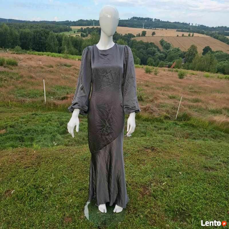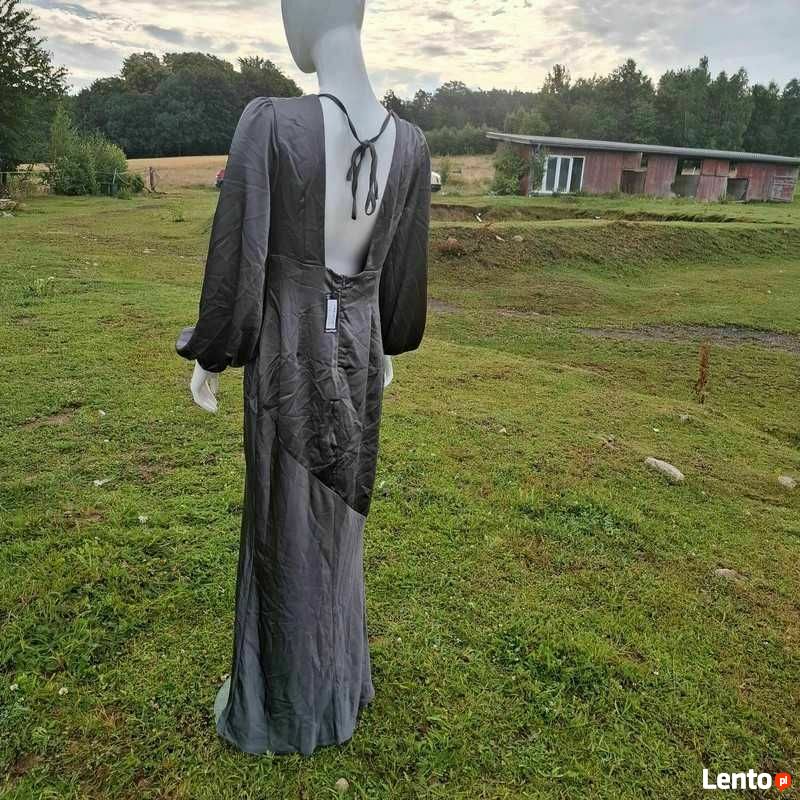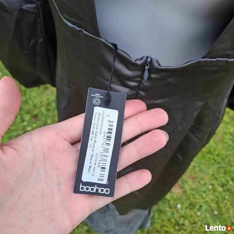 Zjawiskowa sukienka maxi od Boohoo – nowa z metką, nigdy nieużywana Kolor szlachetnej szarości, lekko połyskujący materiał i elegancki fason tworzą styl glamour w najlepszym wydaniu. Dopasowany krój z bufiastymi rękawami oraz odkryte plecy z wiązaniem na szyi robią spektakularne wrażenieRozmiar: L / 40 / UK 12 Stan: nowa z metką Marka: Boohoo Styl: wieczorowa, ślubna, imprezowa Materiał: błyszczący, miękki, przyjemny w noszeniu