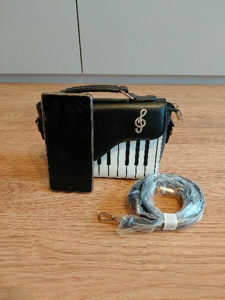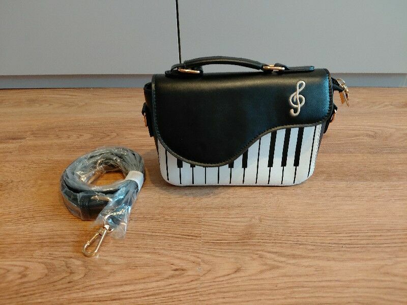 Sprzedam uroczą, nową torebkę w stylu muzycznym, idealna dla miłośników muzyki lub jako oryginalny prezent.Torebka ma wzór klawiatury pianina oraz ozdobną nutkę na klapce. W zestawie dołączony jest regulowany pasek (jeszcze w folii).