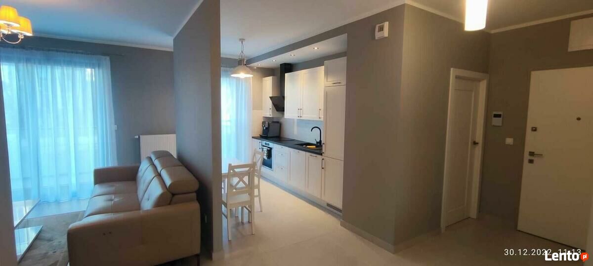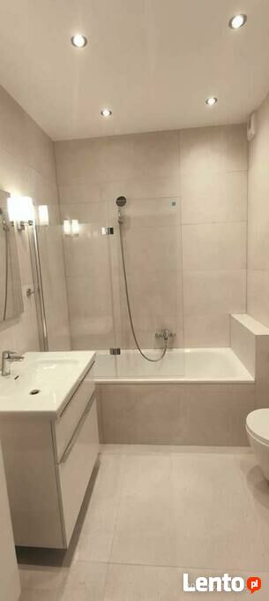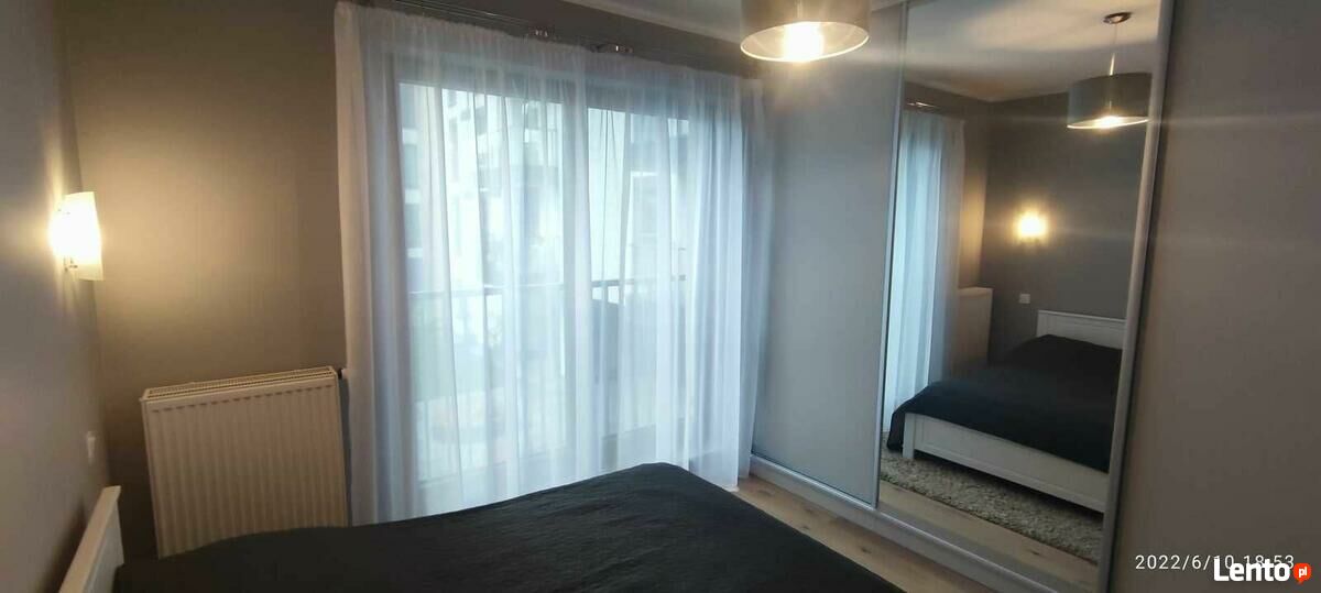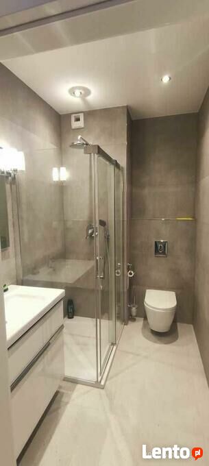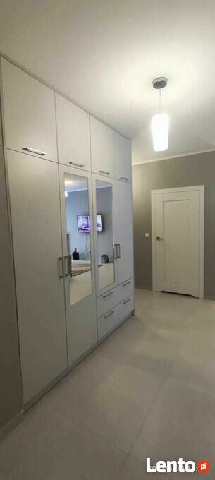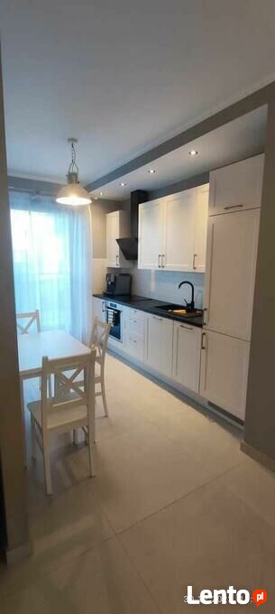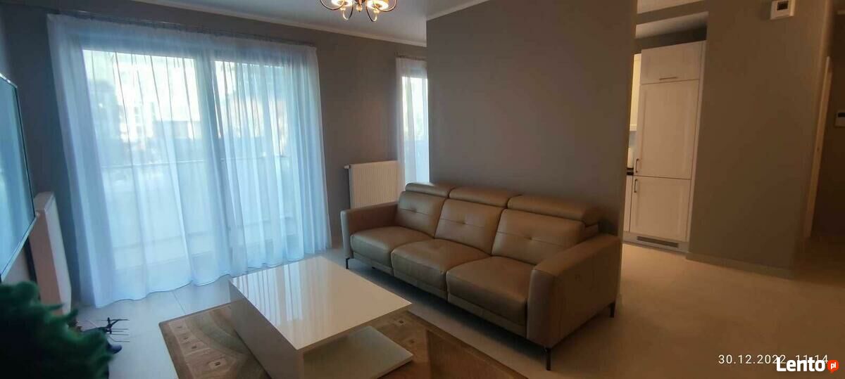 Lokal trzy pokojowy z oddzielną, częściowo otwartą na salon kuchnią. Kuchnia wyposażona w sprzęt AGD (lodówka z oddzielną zamrażarką w zabudowie, zmywarka, piekarnik, płyta elektryczna, okap). Ponadto pokój dzienny wyposażony między innymi w skórzaną kanapę firmy KLER z funkcją rozkładania oraz 2 oddzielne sypialnie. Jedna sypialnia całkowicie umeblowana w podwójne łóżko oraz dużą szafa w zabudowie. W mieszkaniu są 2 łazienki jedna z wanną druga z kabiną prysznicową. W przedpokoju również duża, pakowna szafa na wymiar.