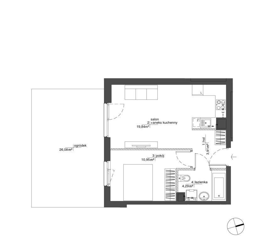 salonu z aneksem (19,84 m²) pokoju (10,95m²)łazienki (4,29 m²)holu