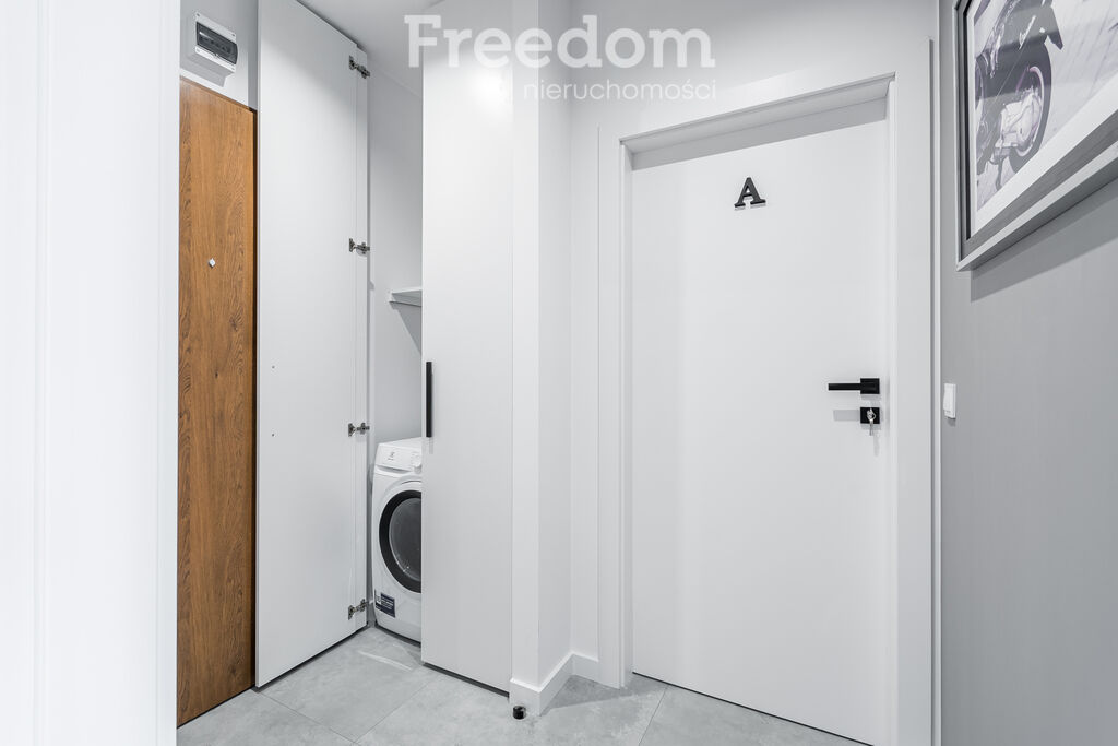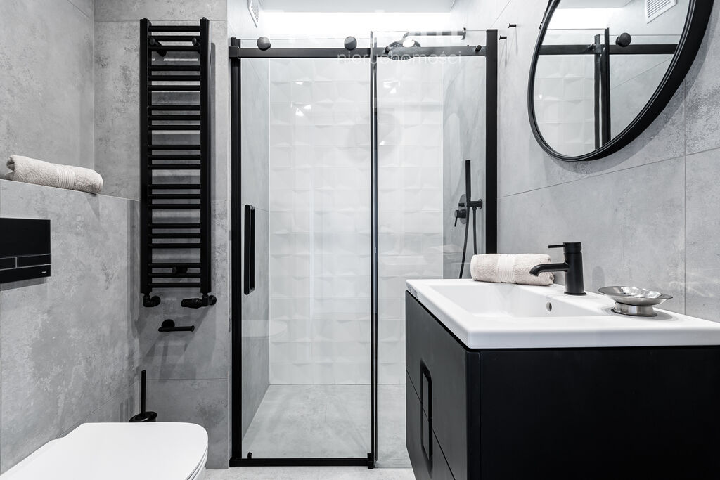 Łazienka z kabiną prysznicową. Pralka ukryta w szafie w