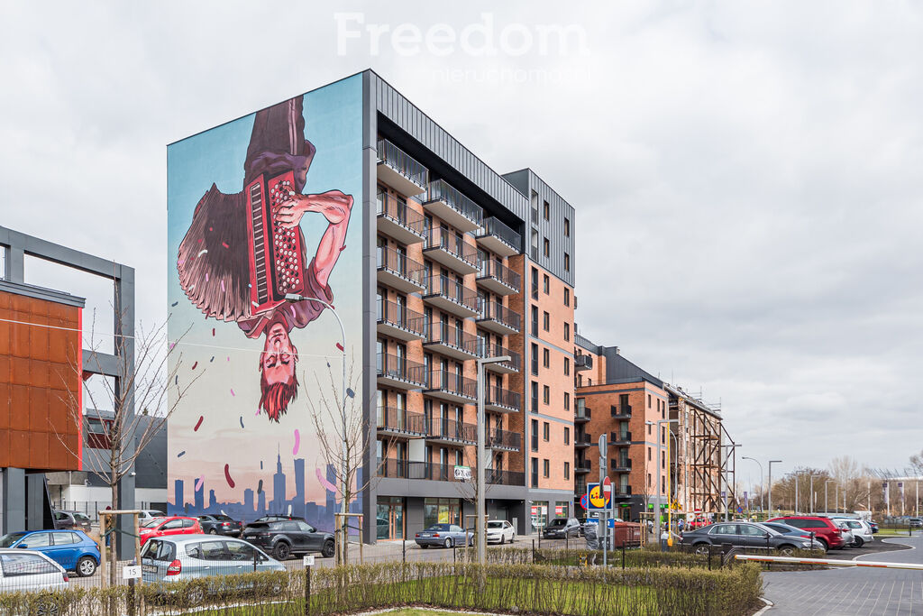 Na bocznej elewacji, wyjątkowy, wielkoformatowy mural. Lokal znajduje