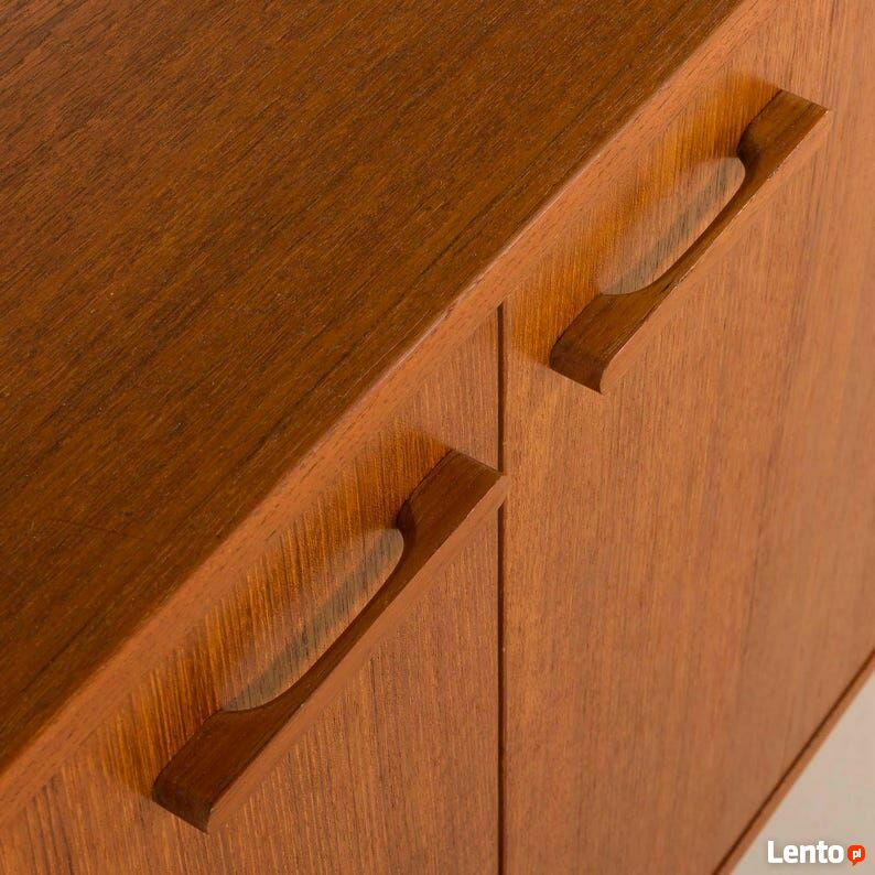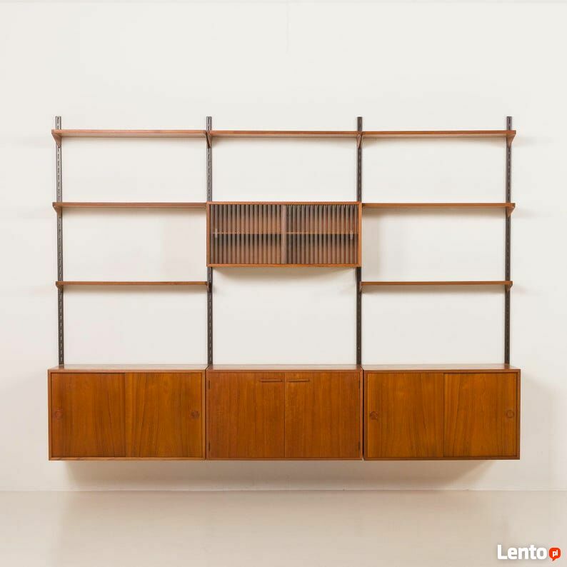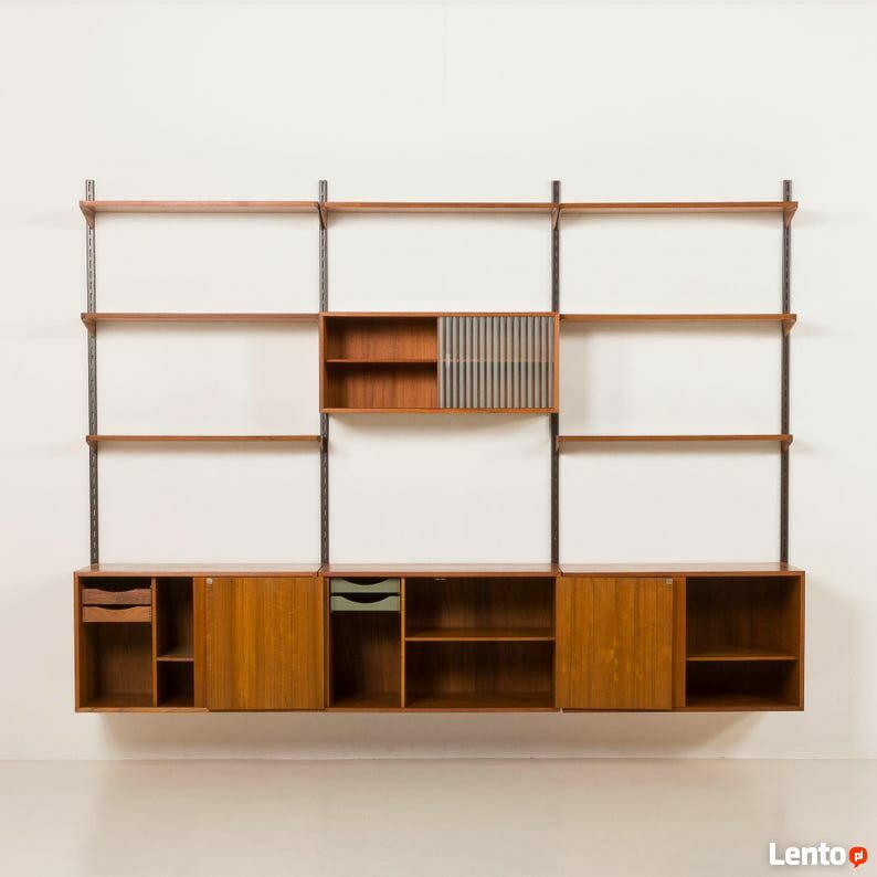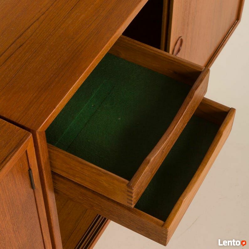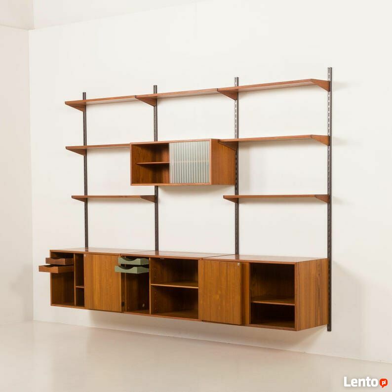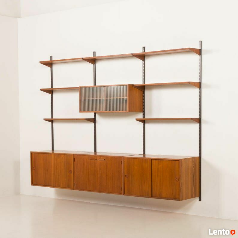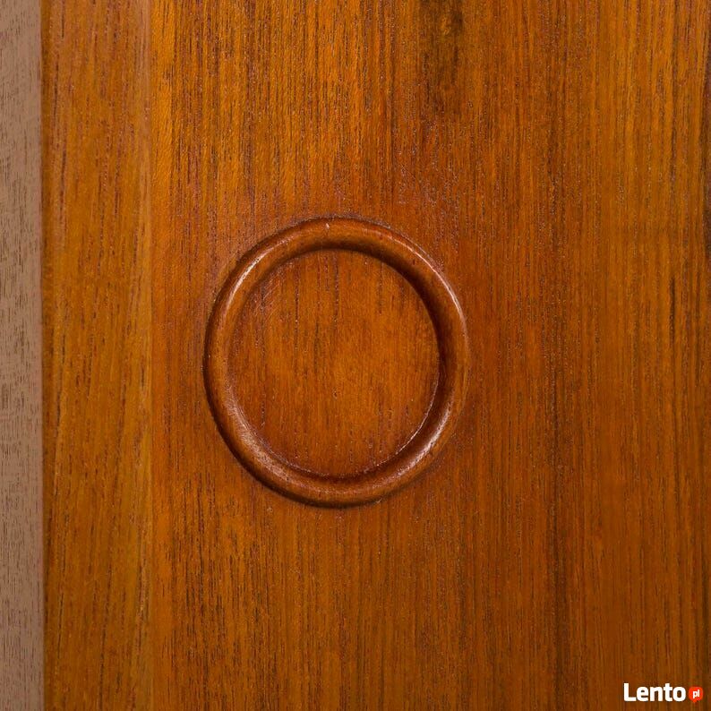 Kai Kristiansen, nowoczesna ścienna jednostka z teaku z lat 60. XX wieku dla FM Mobler, DaniaDuńska jednostka ścienna z teaku, zaprojektowana przez Kaia Kristiansena dla FM Mobler w latach 60., pokazuje biegłość rzemiosła duńskiego. Znacznik producenta jest zachowany.