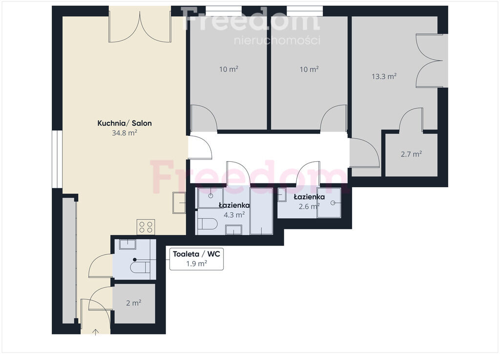 m²Dwie łazienki: 4,3 m² oraz 2,6 m²Oddzielna toaleta 1,9