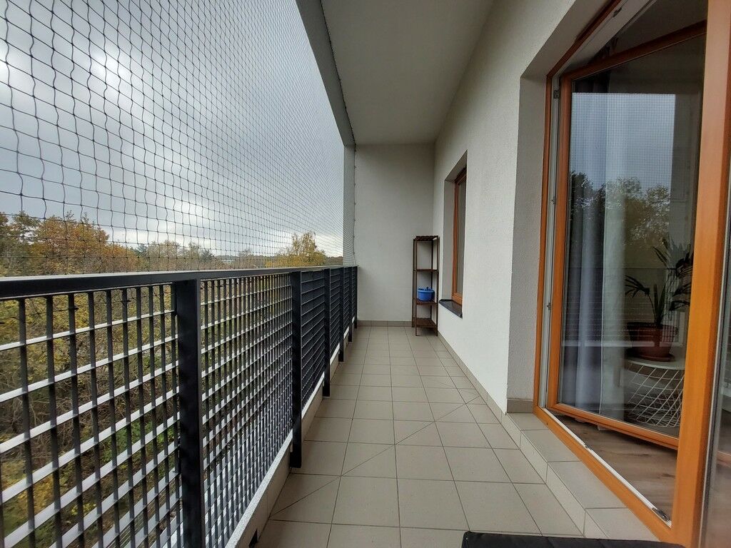 wyjście na przestronny balkon typu loggia zabezpieczony przed