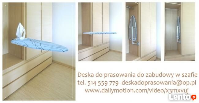 Deska do prasowania do zabudowy w szafie lub garderobie. Mechanizm umożliwia szybkie rozkładanie i składanie deski, pracuje płynnie i cicho. Po złożeniu do szafy deska zajmuje niewiele miejsca.www.dailymotion.com/video/x5rx926 - film jak działa deska - skopiuj link do swojej przeglądarki