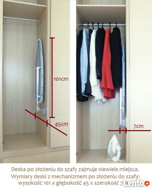 Wymiary deski z mechanizmem po złożeniu do szafy: wysokość 101 x głębokość 45 x szerokość 7 cm
