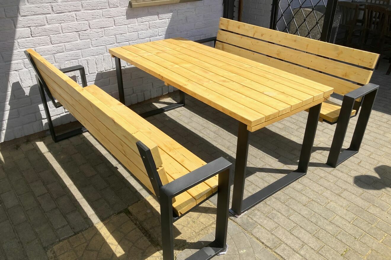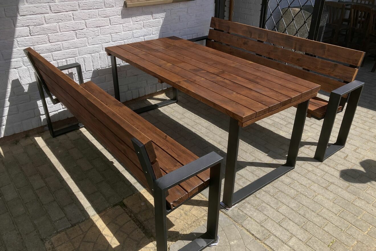 Przedmiotem sprzedaży jest elegancki i wygodny zestaw mebli ogrodowych "MODERNO"Komplet wykonany z drewna ŚWIERKOWEGO, składający się ze stołu i 2 ławek. Nogi metalowe malowane proszkowo, profil 8x2