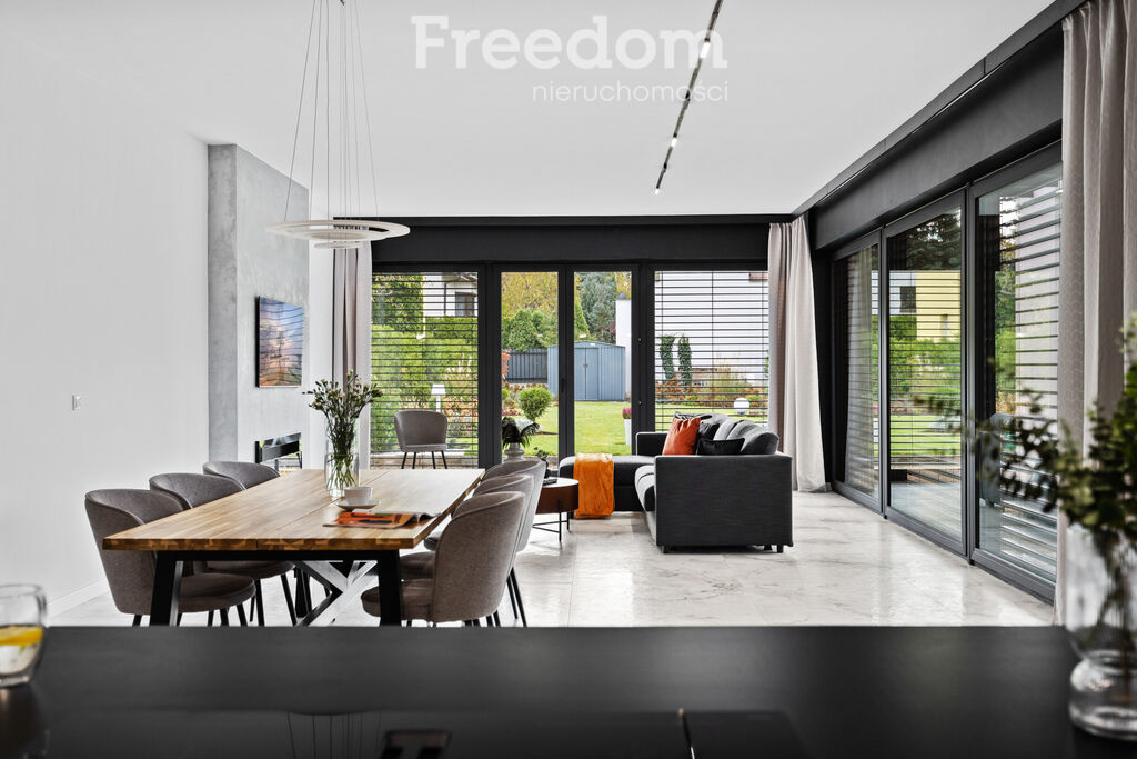 przeszkleniami z czarnymi ramami i elektrycznie sterowanymi roletami,