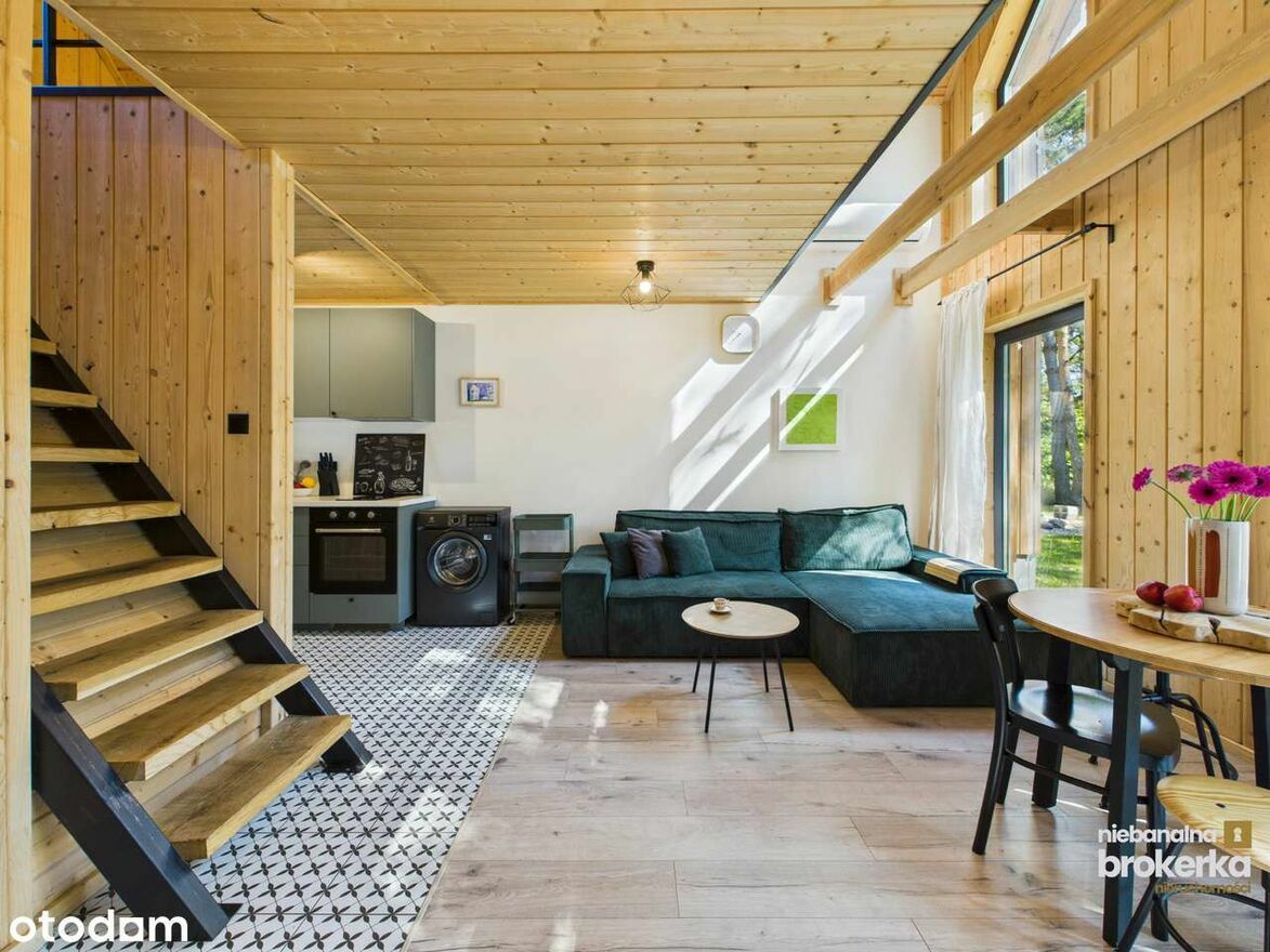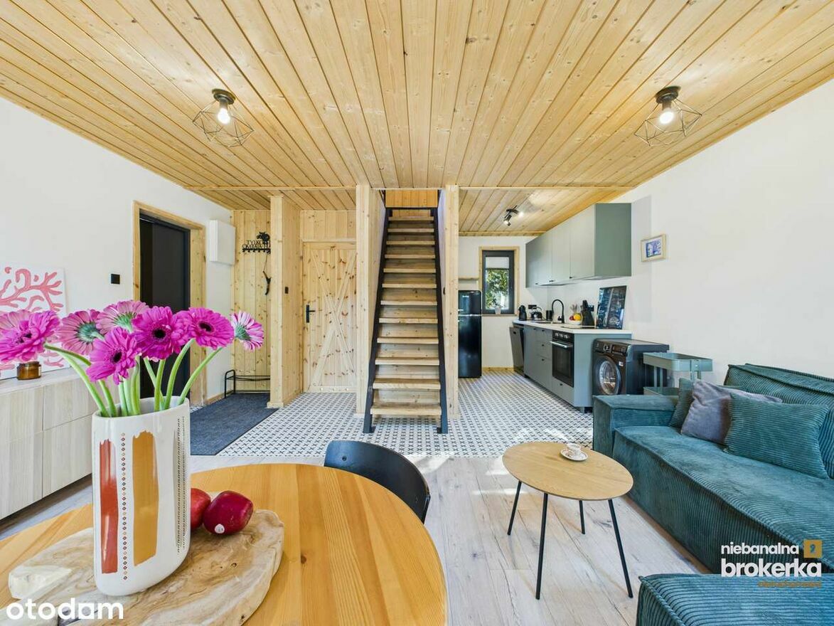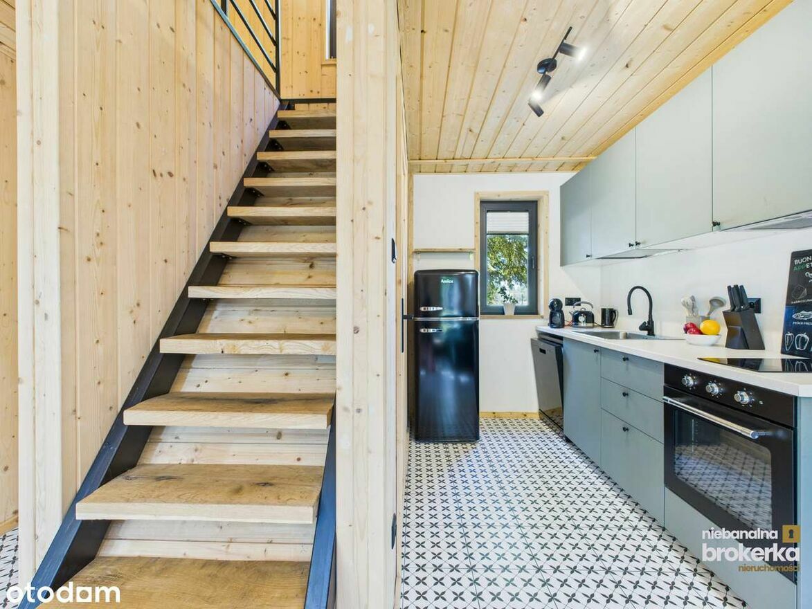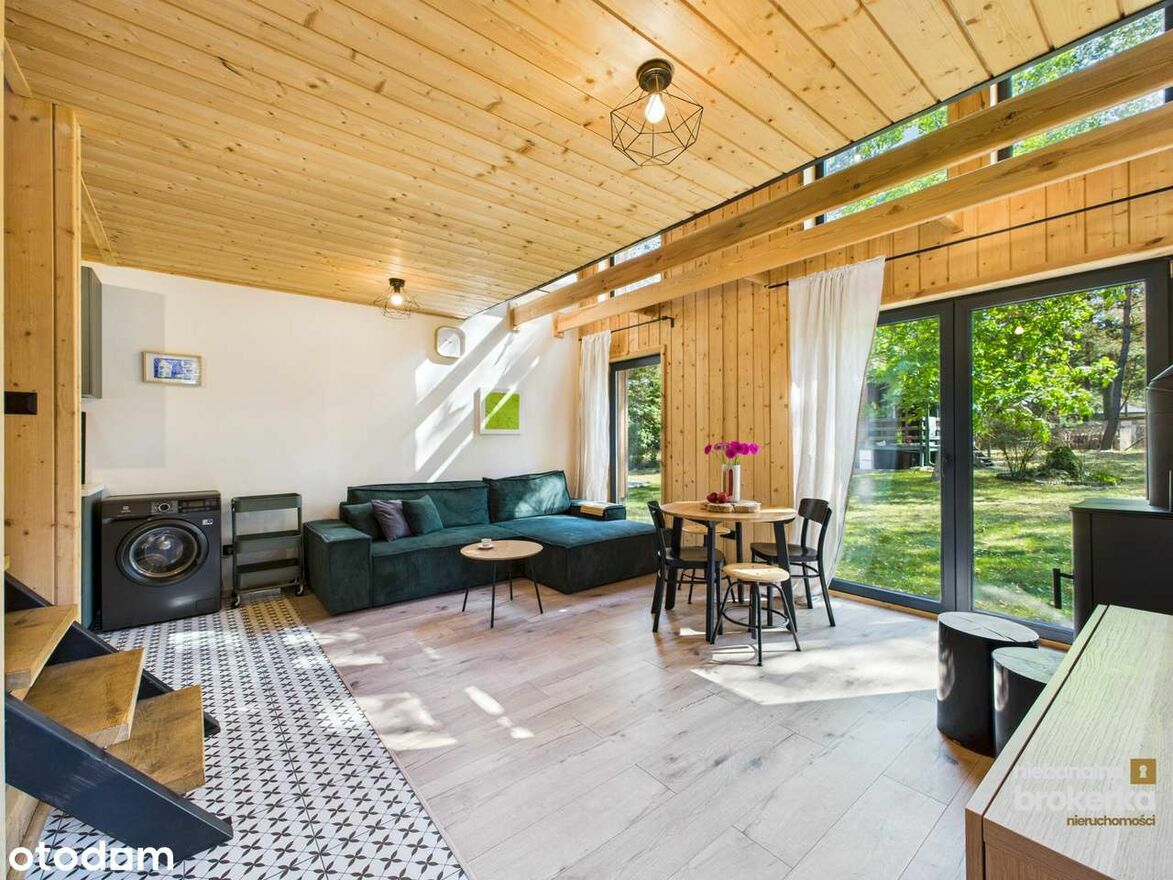 Dom jest w pełni wyposażony – czekają na Ciebie meble na wymiar, nowoczesne AGD (lodówka, zmywarka, pralka), a także kominek i klimatyzacja z funkcją grzania.