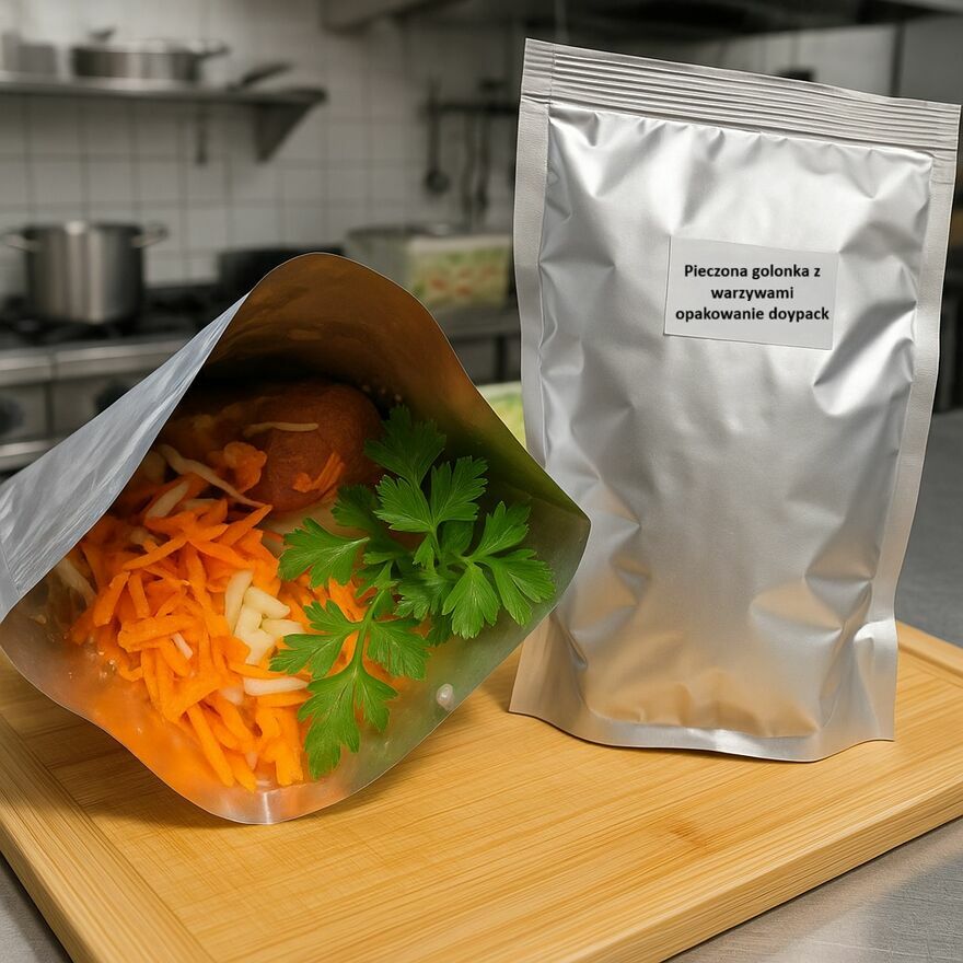 11A. Pieczona golonka wieprzowa z dodatkiem warzyw. Golonka pakowana w specjalnym opakowaniu podanym sterylizacji. Doypack retort posiada cechy metalowej puszki. Pozwala na długotrwałe przechowywanie zawartych w nim produktów – wydłużony termin przydatności do spożycia.