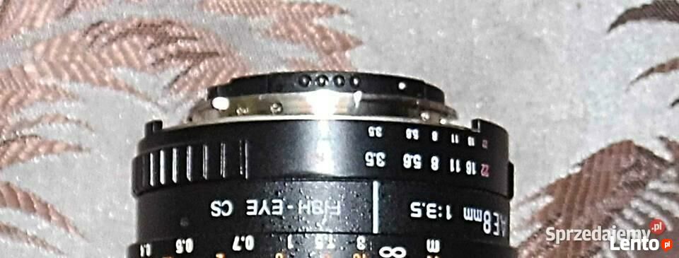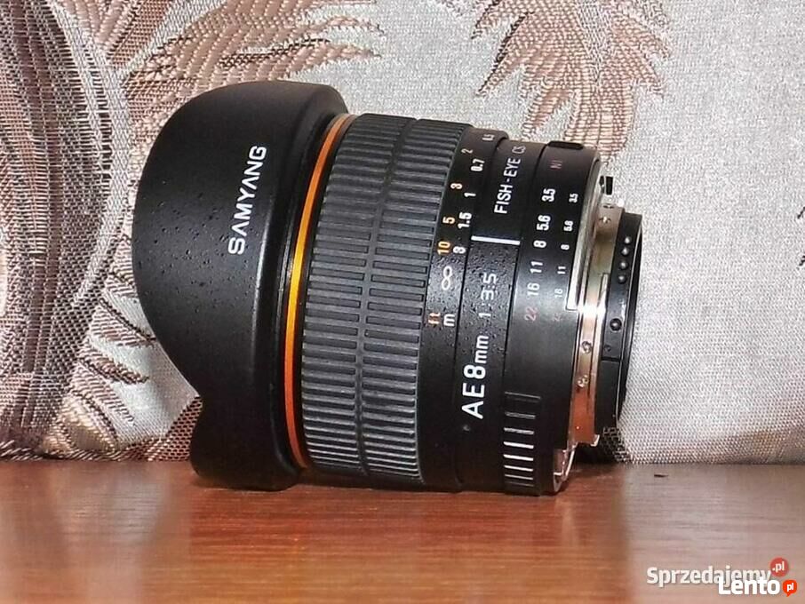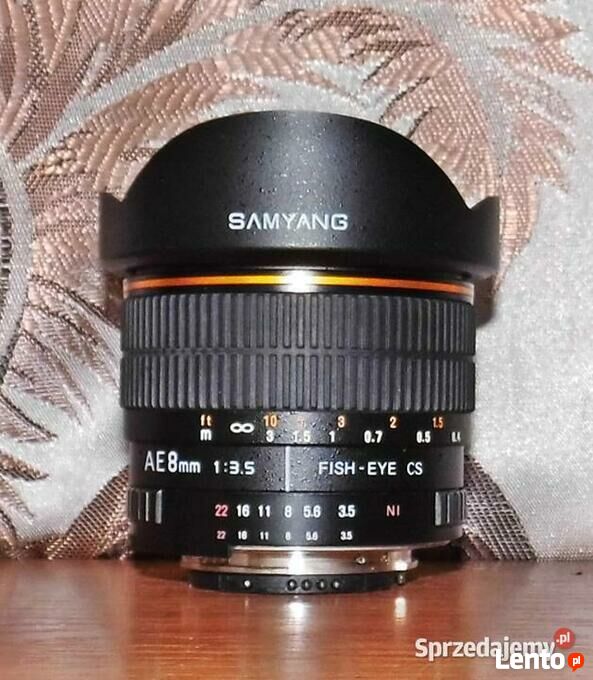 Obiektyw szerokokątny Samyang AE Fish Eye CS 8mm 1:3.5 Ultra szerokokątny obiektyw typu Fisheye o ogniskowej 8mm oraz dużej jasności 3.5. Doskonale nadaje się do efektów specjalnych, zdjęć architektury, bardzo ciasnych pomieszczeń. Kąt widzenia 180 stopni pozwala na uzyskanie bardzo ciekawych efektów. Jest to obiektyw manualny, bez systemu AF. Minimalna odległość ogniskowania to już 30cm. Rzadko spotykana wersja 85 mm z elektroniką. Obiektyw z mocowaniem Nikon F wyposażony jest w układ elektroniczny pozwalający kontrolować parametry ekspozycji z poziomu aparatu, jak również korzystać z zalet automatyki błysku i-TTL. ====================== UWAGA !!! ==================================== Obiektyw nie posiada AF - ostrość należy ustawić manualnie. ===================================================================== $$ - ogniskowa: 8mm %% - przysłona: 3,5 && - minimalna odległośc ostrzenia: 30cm $$ - ustawianie ostrości: manualne %% - kąt widzenia: 180 stopni && - konstrukcja obiektywu: 10 elementów w 7 grupach, $$ - soczewka asferyczna, %% - wielowarstwowe powłoki antyrefleksyjne, ## - płynna regulacja przysłony && - mocowanie Nikon F $$ - dekielek tył, przód + oryginalne pudełko %% - obiektyw nr. D111I1516 - obiektyw rzadko używany, w bardzo dobrym stanie, w 100% sprawny - czyste wnętrze - optyka czysta, szkła bez rys i defektów - pierścienie nie mają luzów, pracują prawidłowo - obudowa w idealnym stanie, z minimalnymi śladami użytkowania - nie był naprawiany ani rozbieranySprawdź zainteresowanie tym ogłoszeniem