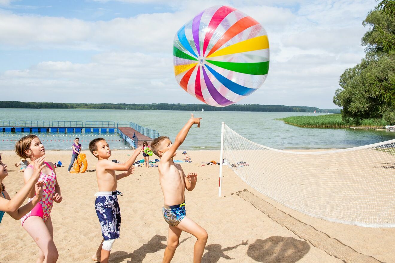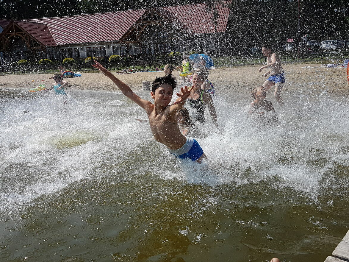 Witajcie, jeziora! – dzięki temu, że mamy plażę na terenie ośrodka, to często będziemy ją odwiedzać. A na niej, pod opieką ratownika i pod okiem wychowawców, będziemy bawić się kolorowymi makaronami, dmuchańcami i wielkimi piłkami.