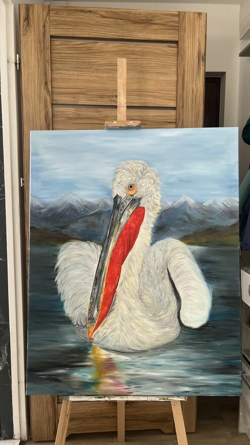 Obraz olejny na płótnie – „Kędzierzawy Pelikan” (100 × 80 cm)Sprzedam ręcznie malowany obraz olejny na płótnie przedstawiający kędzierzawego pelikana.