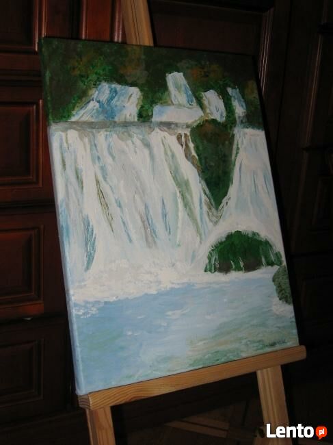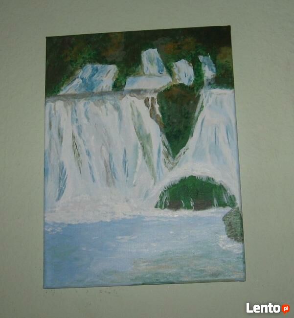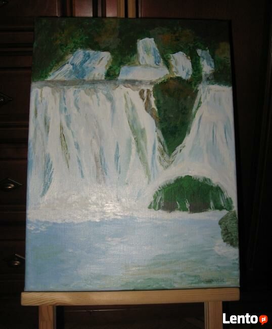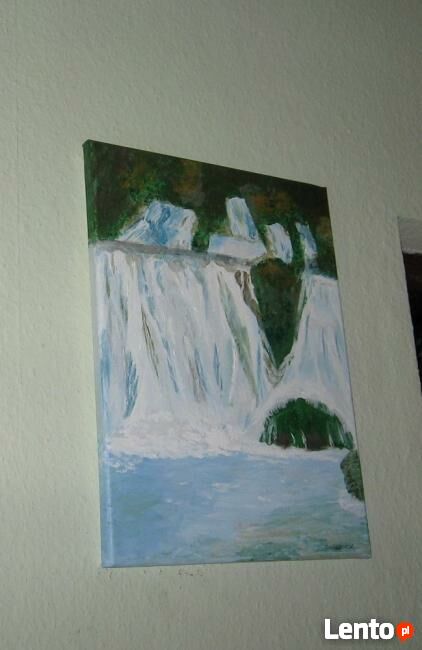 Obraz przedstawiający wodospad, namalowany ręcznie farbami akrylowymi, na płóciennym podobraziu o wymiarach 40x30cm.Boki obrazu zostały zamalowane, można od razu powiesić na ścianie.