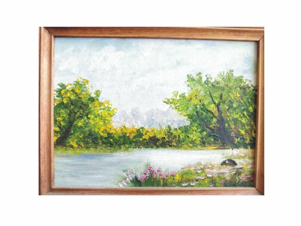 Dzień dobry,mam do zaoferowania obraz ręcznie malowany, osadzony w ramce, z tyłu osłonięty białym papierem, posiada gotową zawieszkę. Tematem obrazu jest pejzaż nad rzeką, zarośla, drzewa i fragment łąki z kwiatami. Obraz jest nowy, nie uszkodzony, piękna ozdoba każdego pomieszczenia.
