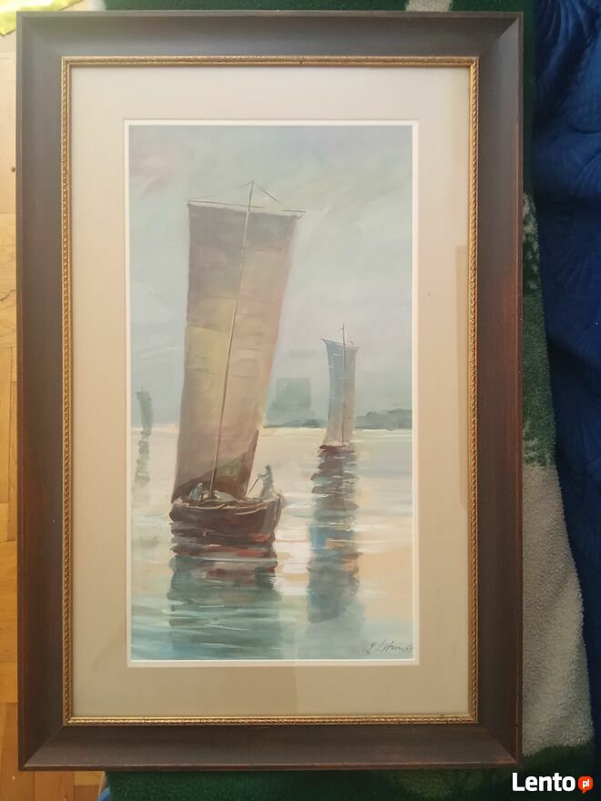 Obraz olejny, pejzaż niderlandzki według daty jest z 1944r. Akwarela z żaglami to obraz znanego polskiego marynisty , Litwina z 1965r. Fortepian poniemiecki, przynajmniej pierwsza połowa XXw., meble też.Sprawdź zainteresowanie tym ogłoszeniem
