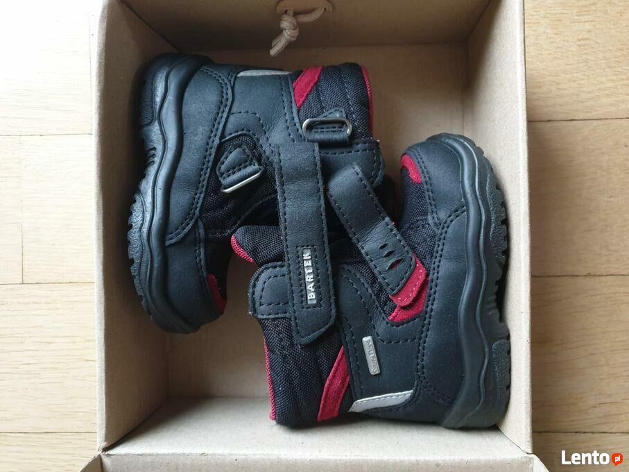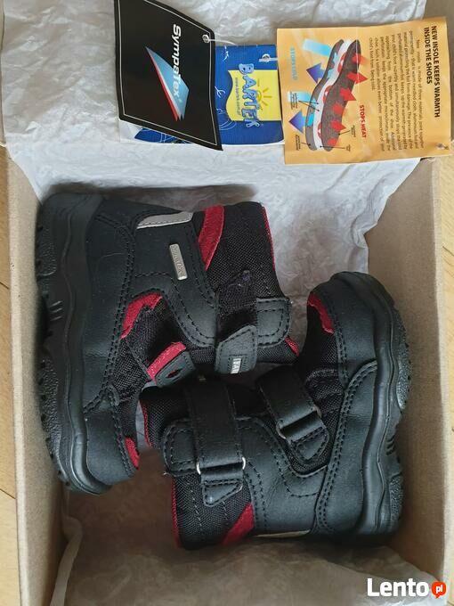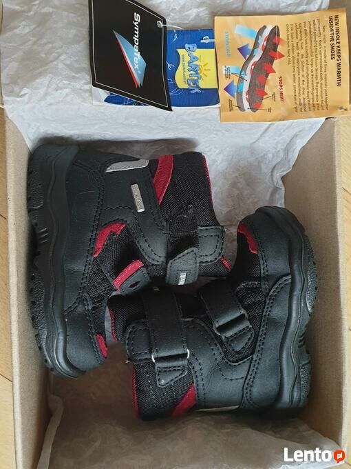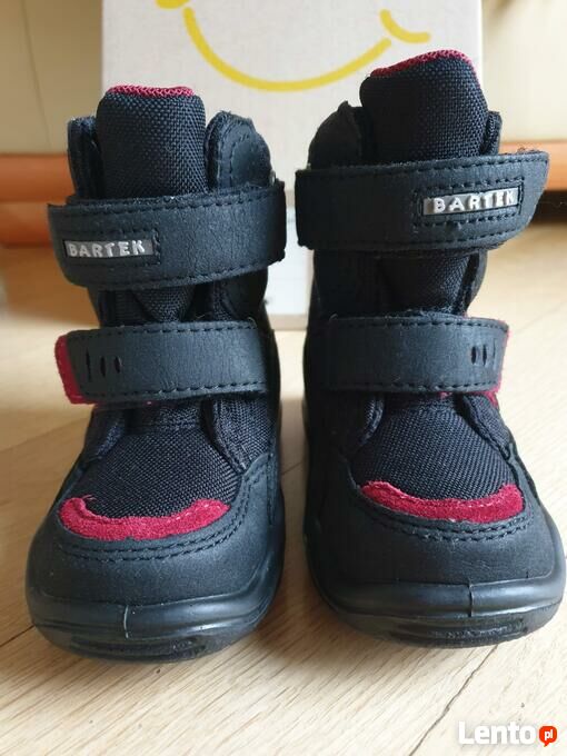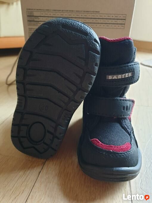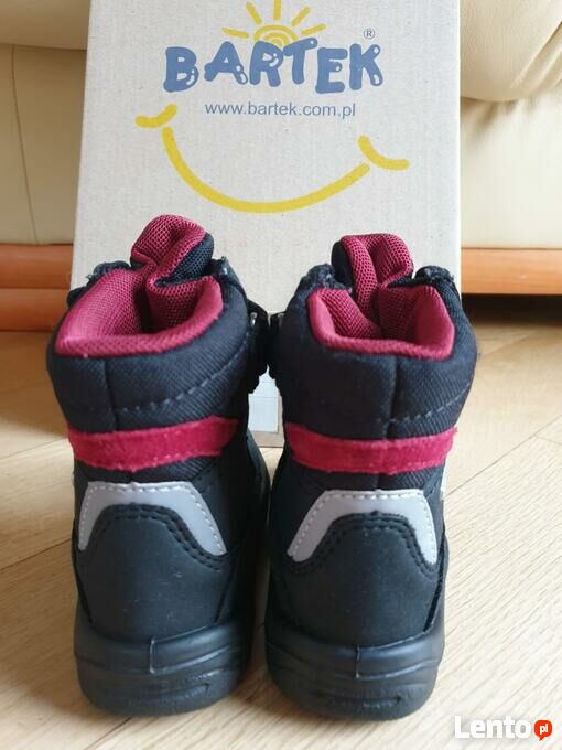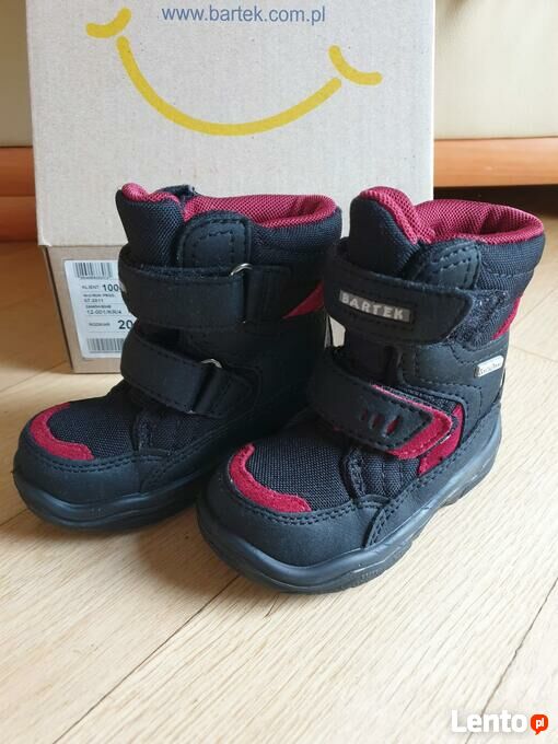 Jeden raz założone zimowe ocieplane trzewiki Bartek Sympatex 100% Wasserdicht (wodoodporny), w kolorze czarno-czerwonym, r.20. Długość wkładki 13,5 cm.Sportowy krój. Nowa wkładka wykonana ze złączonych ze sobą na stałe trzech materiałów - ocieplonej włókniny, folii aluminiowej oraz materiału chroniącego folię przed zniszczeniem.
