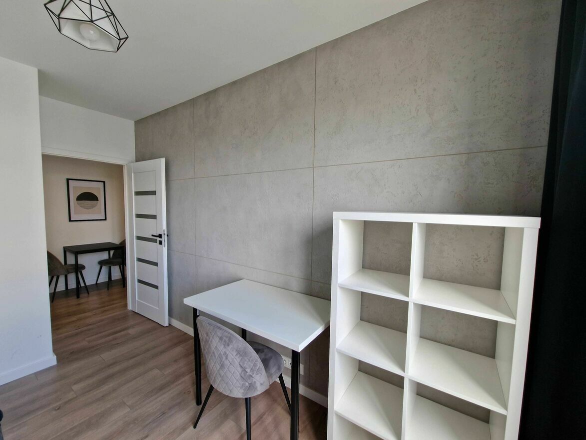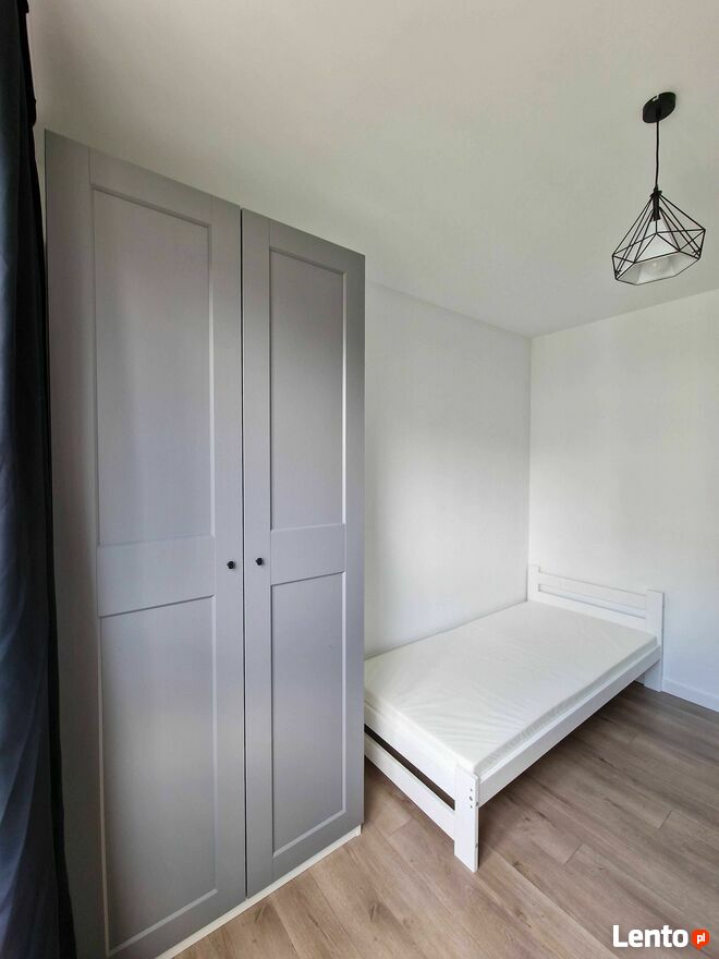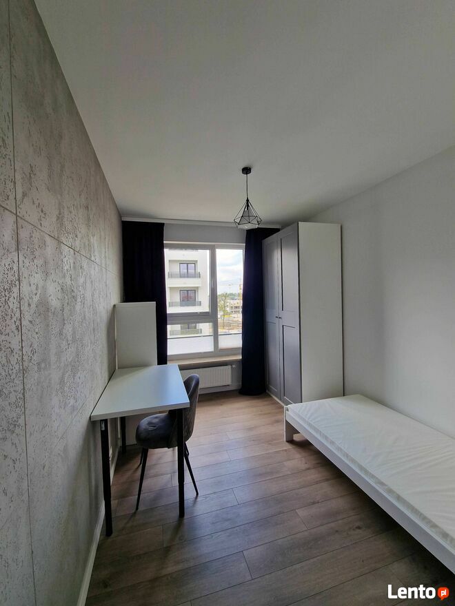 Wyposażenie pokoju: łóżko, duża szafa, biurko, krzesło, regał Kallax do własnej aranżacji, suszarka na pranie. Możliwość aranżacji ścian wg upodobań, nie mamy przeciwwskazań co do wiercenia itp. Pokój zamykany na klucz.