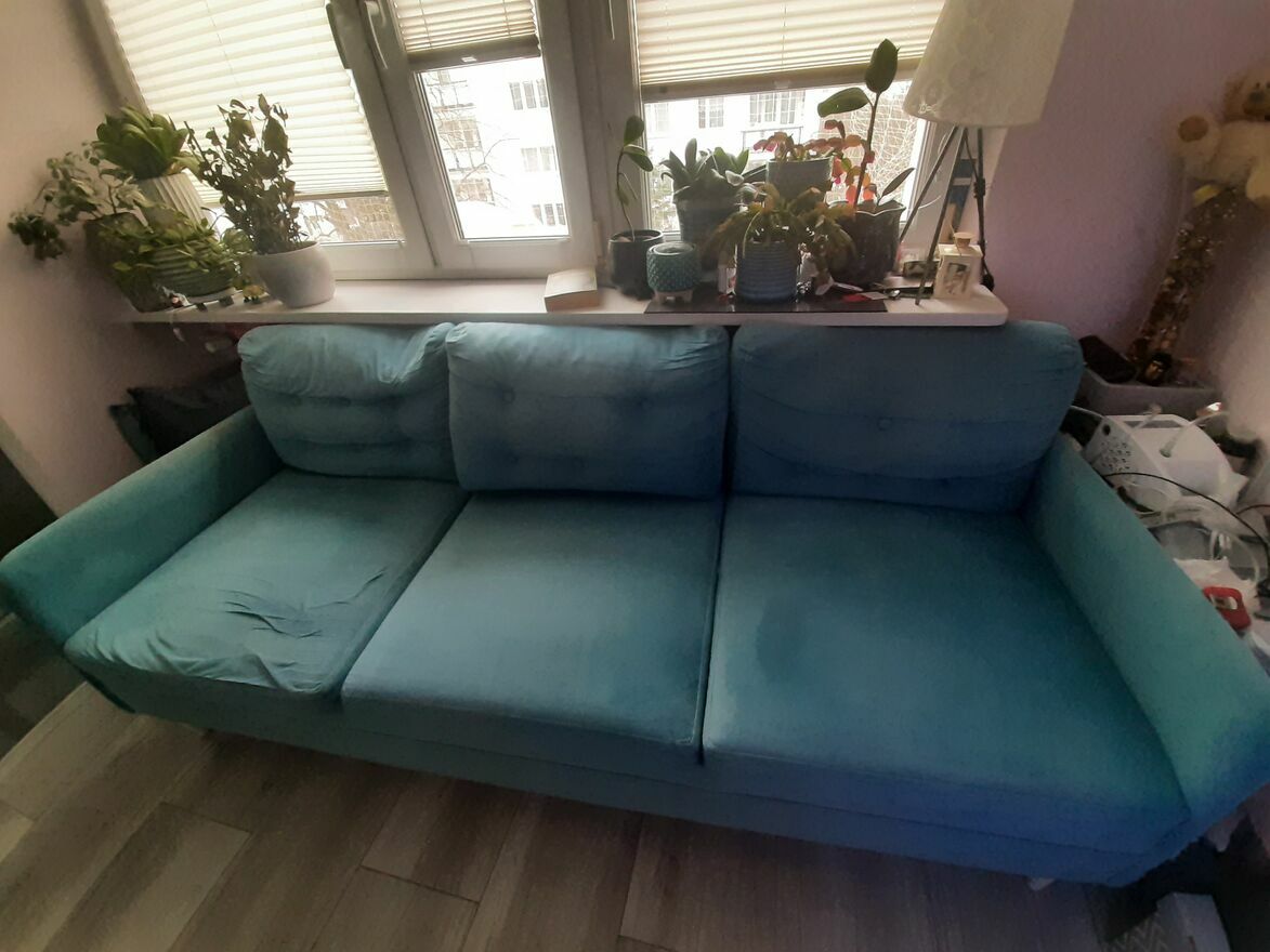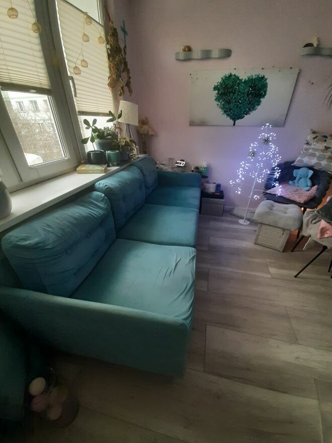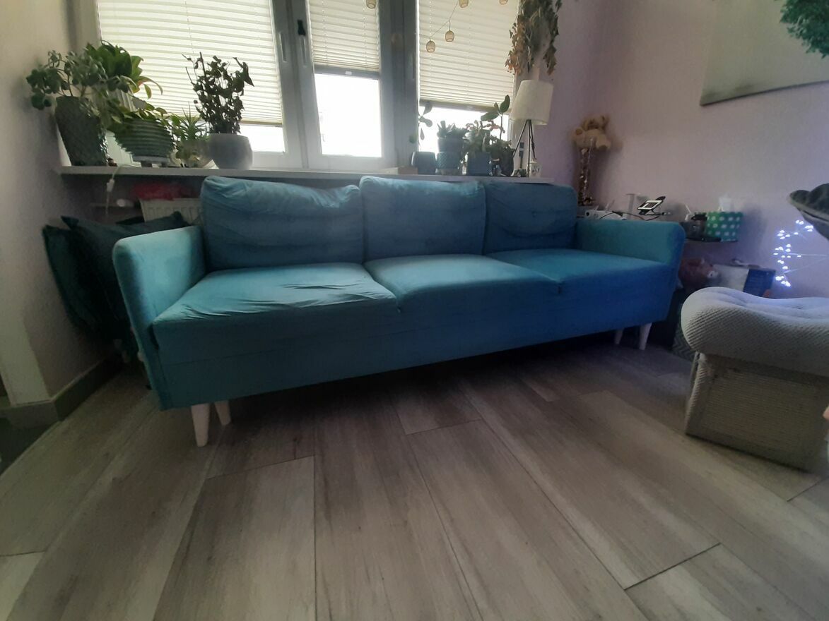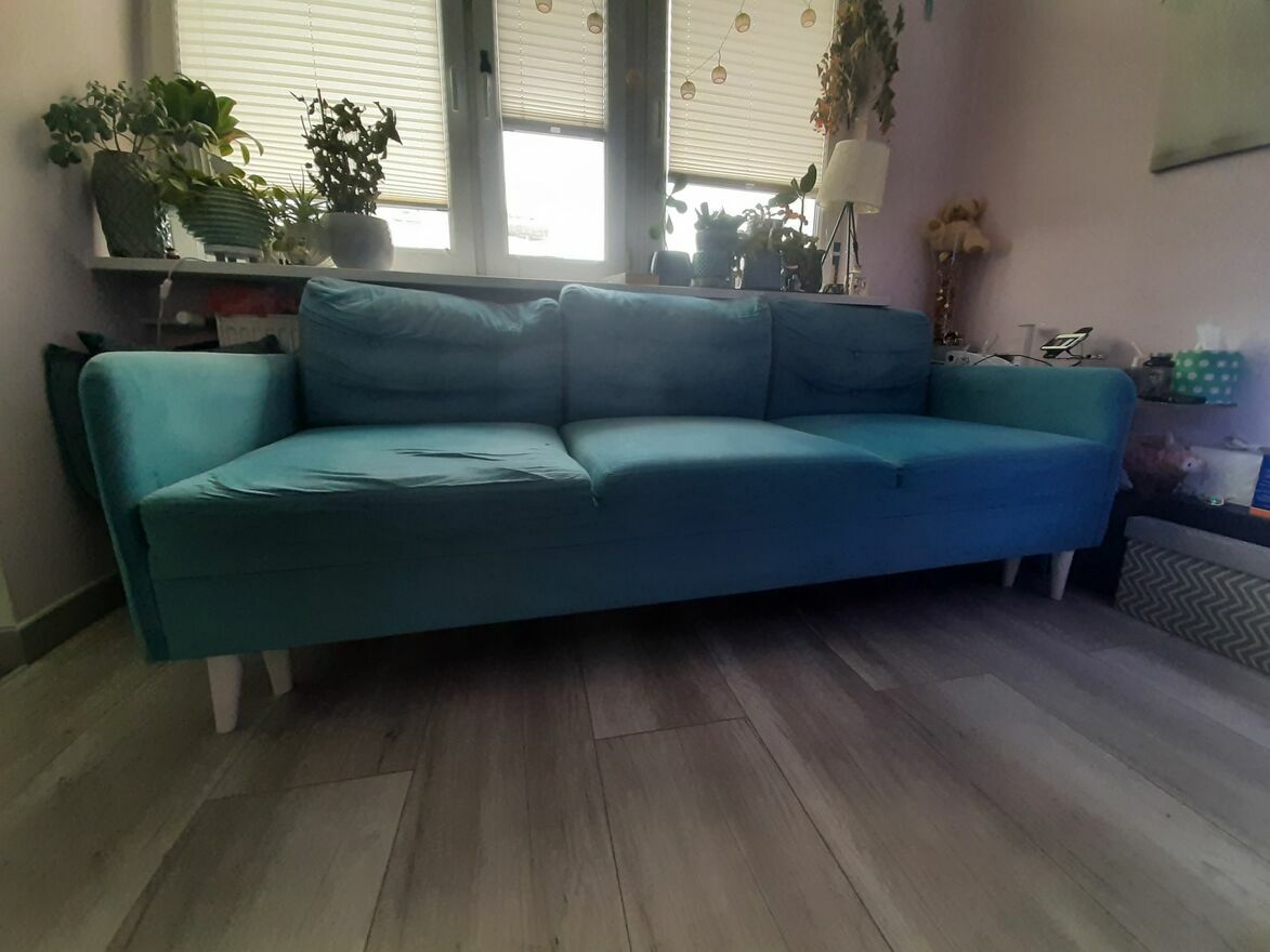Oddam używaną sofę, kolor turkusowy, do odświeżenia, duża sofa rozkładana, wymiary: (szerokość)215x(głębokość)90x(siedzisko)60. Odbiór tylko osobisty własnym transportem. Sofa nosi normalne ślady użytkowania. Na jednym oparciu drobne uszkodzenia powstałe w wyniku drapania przez kota (ost. zdjęcie).Sprawdź zainteresowanie tym ogłoszeniem