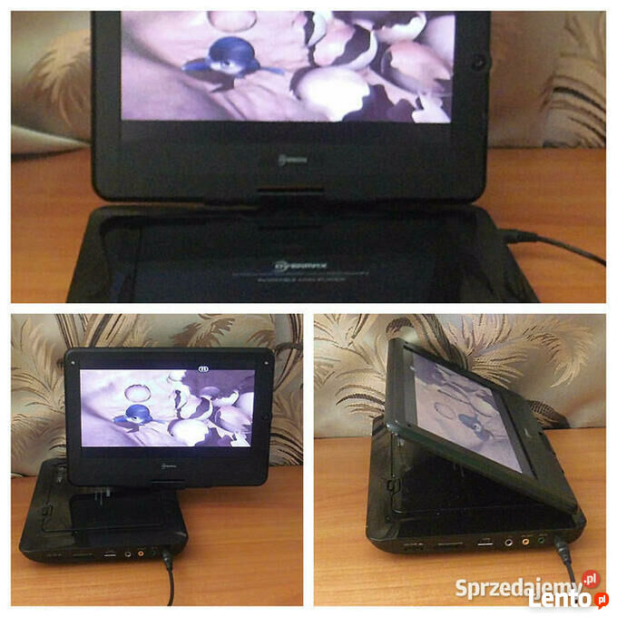 Przenośny odtwarzacz DVD z ekranem LCD o przekątnej 9 cali. Obsługuje płyty DVD-R, DVD+R, CD-R, CD-RW i VCD oraz formaty mpeg4, DivX, mp3, wma i jpg. Posiada tuner TV, złącze USB 2.0, czytnik kart SD i wyjście słuchawkowe. Ƿ - odtwarzacz nr. 0203211*0055 Ƿ - odtwarzane formaty DVD-R, DVD+R, CD-R, CD-RW i VCD MPEG4, DivX, MP3, WMA, JPG Ƿ - posiada tuner TV ( ale nie działa po zmianach systemu nadawania) Ƿ - obrotowy ekran W zestawie : 1. odtwarzacz 2. zasilacz 230V 3. zasilacz samochodowy 4. pilot (baterie AA x 2 Kodak > GRATIS) 5. uchwyt do zawieszenia na zagłówku w samochodzie 6. torba do przenoszenia ***************************************************************************************************************************** Jako GRATIS!!! bajki na płytach szt 17 (różne) 1. Barbie i diamentowy pałac 2. Barbie Rockowa księżniczka 3. Barbie i tajemnicze drzwi 4. Wieża skarbów 5. Truskawkowe ciastko 6. Masza i niedźwiedź 7. Winx w pułapce 8. Piorun i magiczny dom 9. Tridulki 10. Czarodziejski flet 11. Olinek Okrąglinek 12. Żółwik Sammy 2 13. Aladyn 14. Sąsiedzi (7 odc.) 15. Mała Syrenka 16. Alicja w krainie czarów 17. Scooby-Doo i drużyna gwiazd Płyty z muzyką : 1. Mini Mini party 2. Majkowe przeboje ****************************************************************************************************************************** Odtwarzacz sprawny 100%. Stan wizualny 4/6. Porysowana obudowa i środek. Ekran czysty.Sprawdź zainteresowanie tym ogłoszeniem