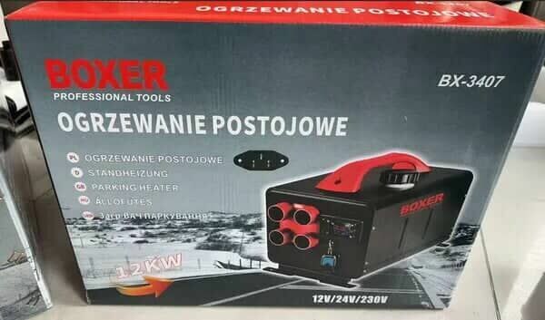 Ogrzewacz Webasto postojowy 12/24/220V, 12 kW Boxer BX-3407 z pilotemNagrzewnica przenośna 12 kW na olej napędowy Boxer BX3407. Webasto na olej napędowy Boxer BX 34007 służy do ogrzewania pomieszczeń, pojazdów, garaży oraz utrzymywania zadanej temperatury. Urządzenie można zasilać zarówno ze standardowego gniazdka 220 V, jak i z akumulatora 12/24 V, co znacznie rozszerza zakres jego zastosowania. W zestawie znajduje się pilot zdalnego sterowania ułatwiający obsługę.