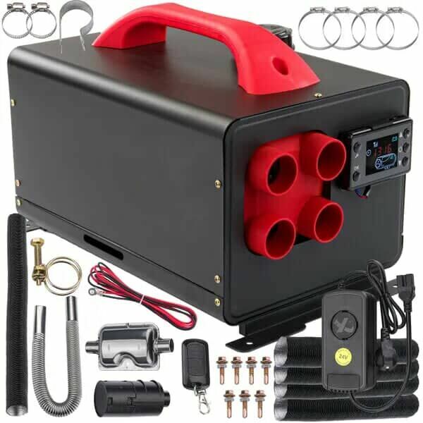 - Zawartość opakowania: autonomiczny podgrzewacz, filtr powietrza, rura wylotowa gorącego powietrza, rura wydechowa komory spalania, rura wlotowa komory spalania, tłumik, zdalne sterowanie ekranem, kabel zasilający 220 V, zestaw elementów złącznych, instrukcja.