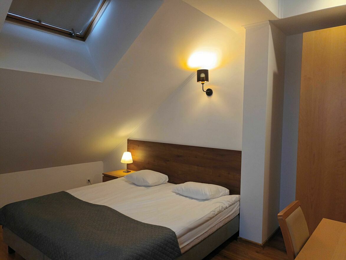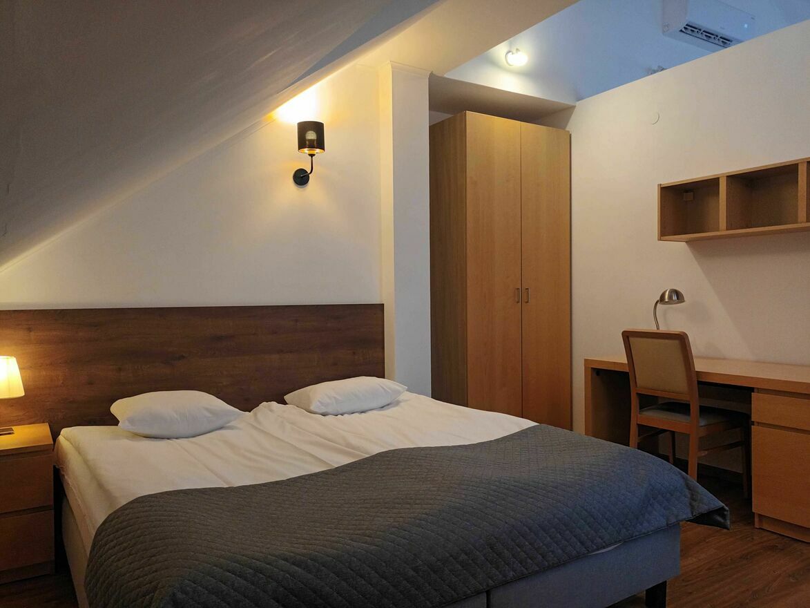 • sypialnia – jedno łóżko dwuosobowe, szafa, szafka nocna, biurko, pościel,