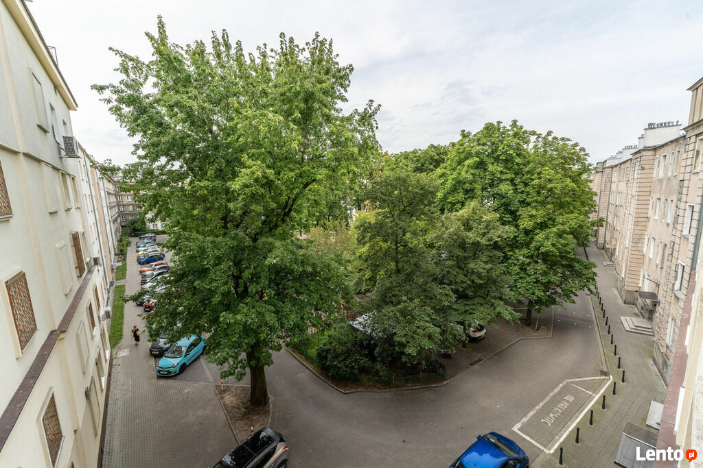 Okna wychodzą na zielone podwórko z licznymi miejscami parkingowymi.