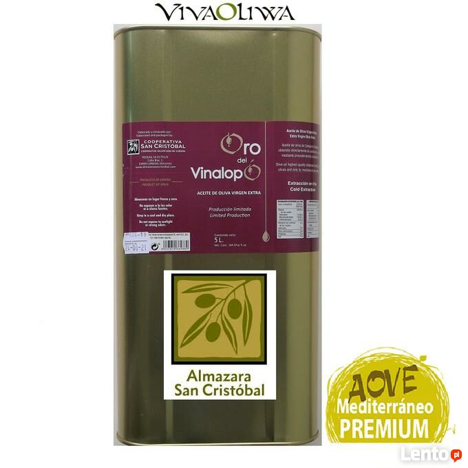 Oliwa z Oliwek Extra Virgen ORO DEL VINALOPÓ, świeża, puszka 5L.Oliwa z oliwek najwyższej kategorii otrzymana bezpośrednio z soku wyciskanych oliwek, tłoczonego na zimno !!! za pomocą środków mechanicznych, czyli bez użycia jakichkolwiek środków chemicznych.
