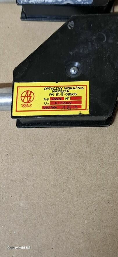 Widoczne na zdjęciu urządzenie to optyczny wskaźnik napięcia, typ OWN. Jest to sprzęt ochronny, który służy do sygnalizowania obecności wysokiego napięcia.Kluczowe informacje z etykiety: