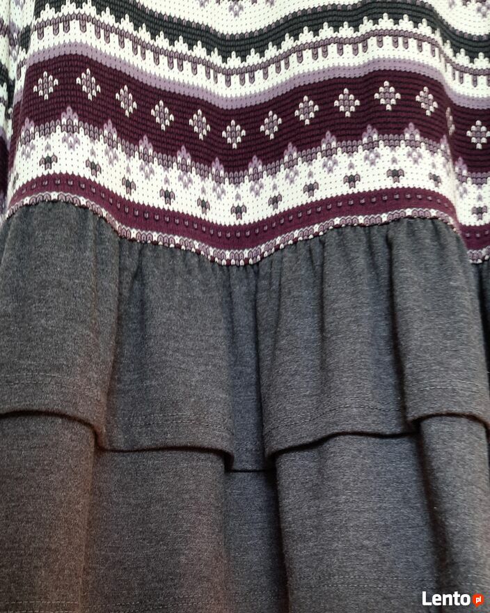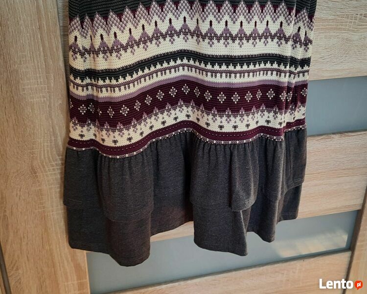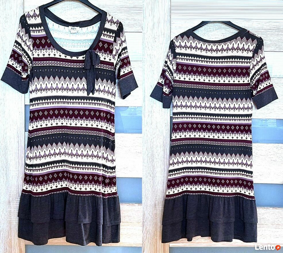 Sprzedam: turecka, bardzo dziewczęca SUKIENKA, oryginalny wzór i materiał; lekko rozciągliwa, rozmiar EU 36-38, zakończona dwiema falbanami. Długość całkowita ok. 97 cm, krótki rękaw (długość z mankietem 29 cm). Stan bardzo dobry (zdjęcia) – jak nowa. Sukienka przewiewna, pięknie układa się na sylwetce, bardzo efektowna, praktyczna i wygodna, można prać w pralce (nie wymaga prasowania).Cena 25 zł. Warszawa-Bielany, tel. 507 - pokaż numer telefonu - .