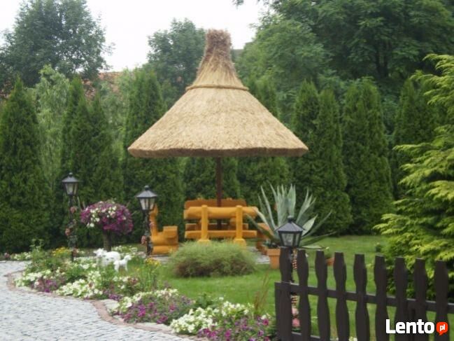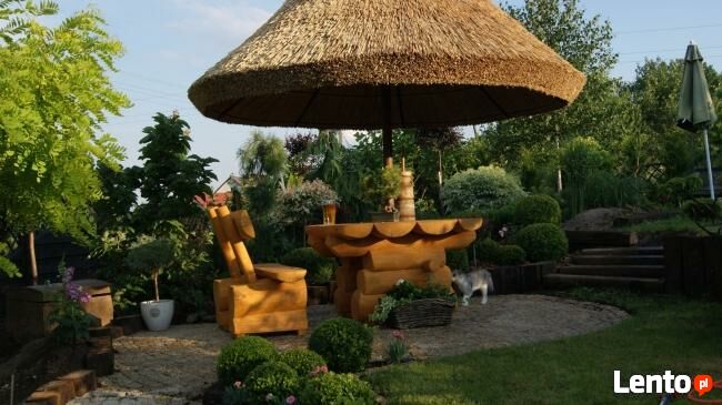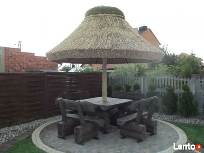 Parasol kryty trzciną, meble z bali do ogrodu, zajazdu, baru