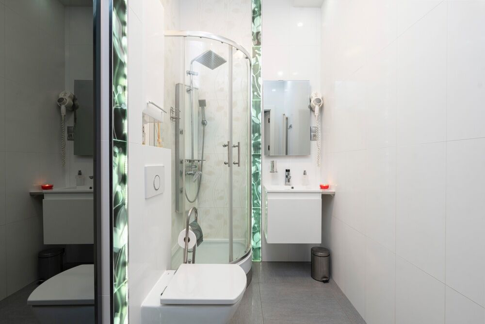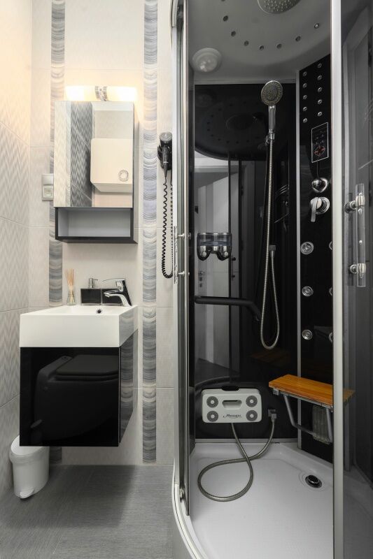 The heart of the apartment is an impressive 33.4 m² living room, harmoniously connected to an open-plan kitchen. The kitchen is equipped with stone countertops and premium-class household appliances, creating a space where you can fully indulge your culinary passions. This area also features an elegant guest bathroom.
