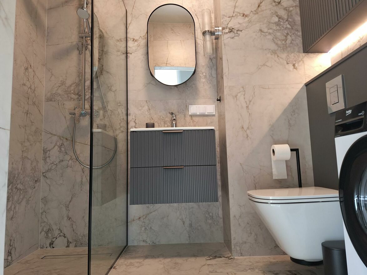 Łazienka ok. 3,5 m2 z nowoczesną kabiną prysznicową, hol ok. 3 m3 z wyjściem na kameralną klatkę schodowa, tylko na dwa mieszkania w tej części, nieopodal winda z możliwością wjazdu na piętra i garażu.