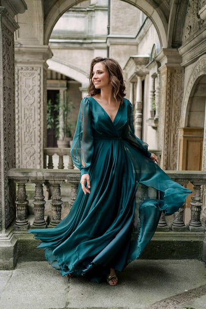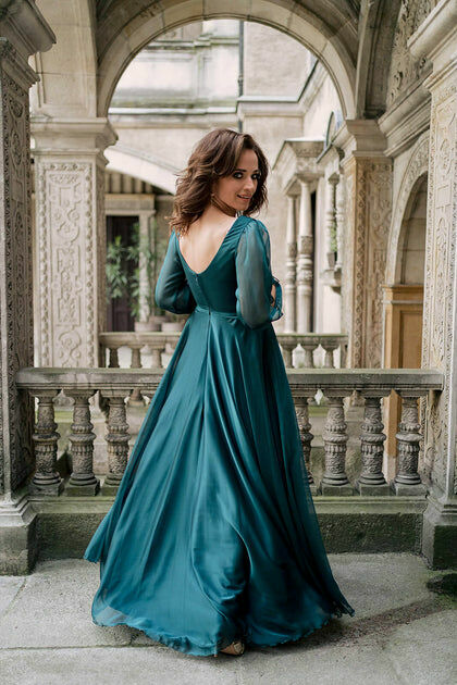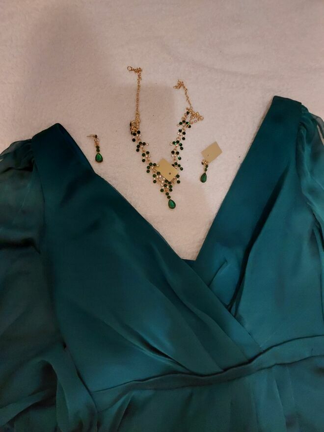 Sukienka w kolorze szmaragdowej zieleni. Zarówno konstrukcja sukienki, materiały jak i uszycie są rewelacyjne. Suknia pięknie się układa w ruchu. Ma delikatne rękawki więc sprawdzi się na przyjęcia okolicznościowe zarówno latem jak i zimą.