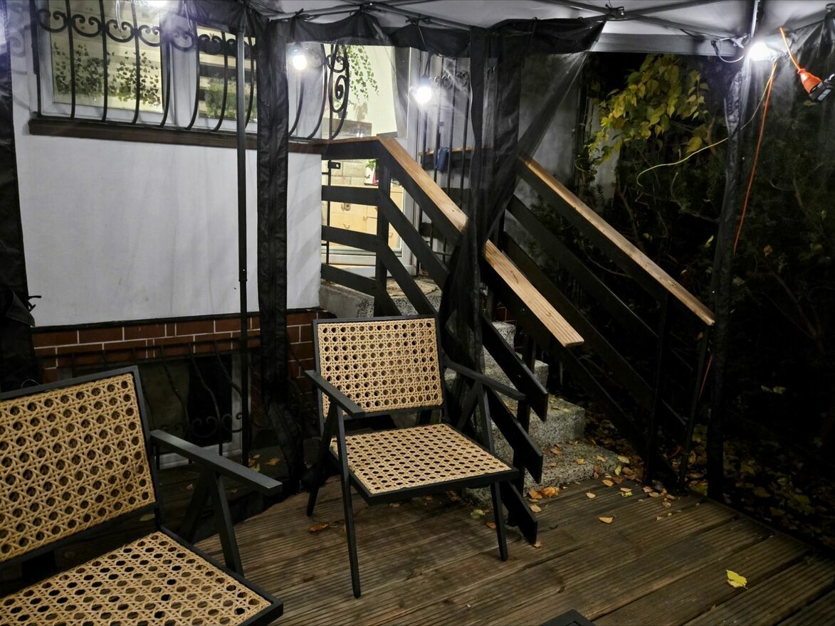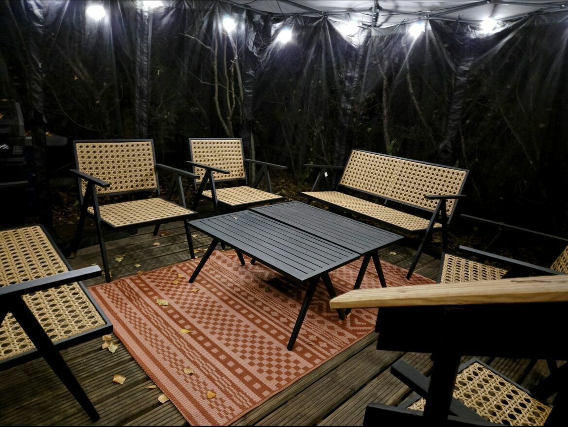 -małego ogródka otoczonego zielenią z namiotem pod którym są meble ogrodowe