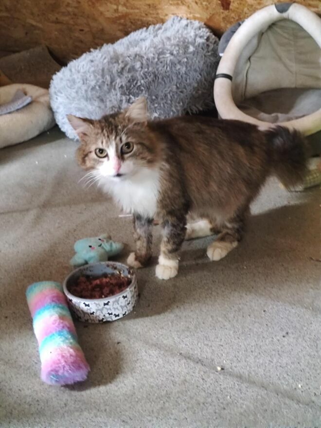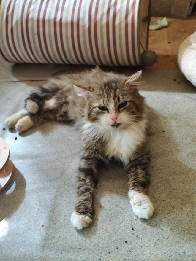 Historia tego pięknego kota pokazuje, że nawet wyjątkowa uroda i cudowny charakter nie są w stanie uchronić bezbronnego kota od bezdomności.Zakrwawiony, wychudzony maszerował wzdłuż szosy na rogatkach Warszawy. Podejrzewamy, że mógł zostać po prostu wyrzucony z samochodu.
