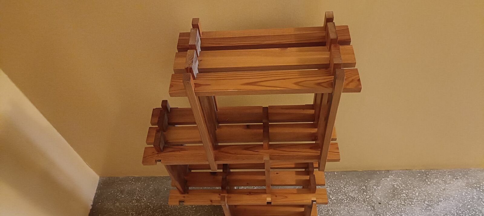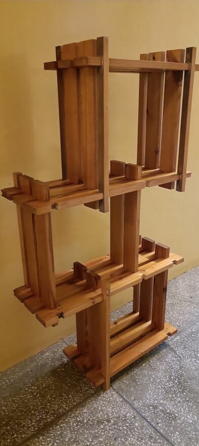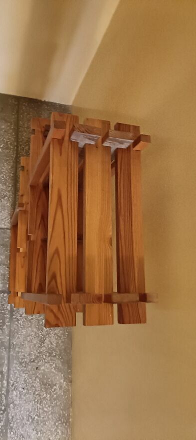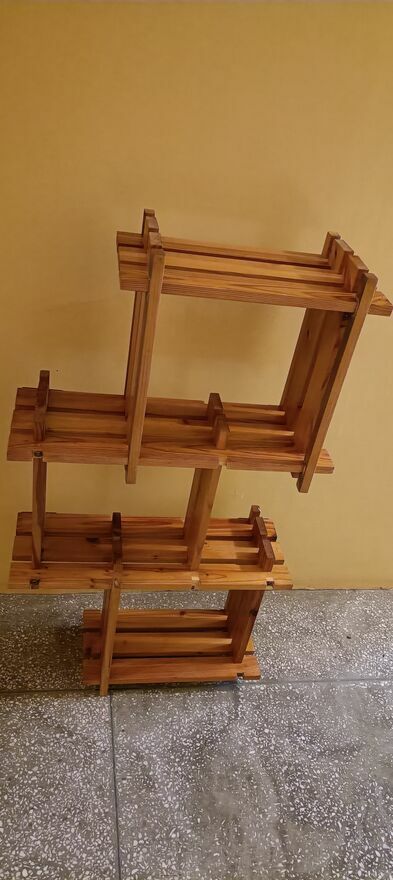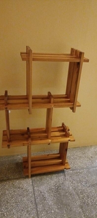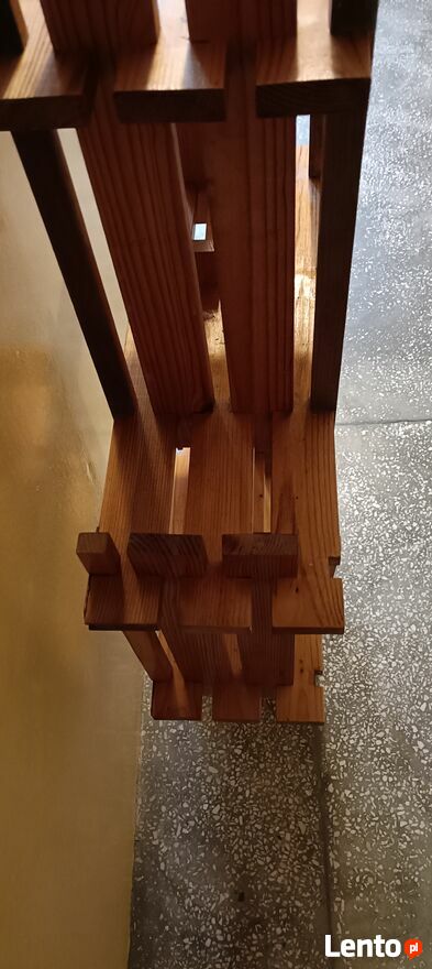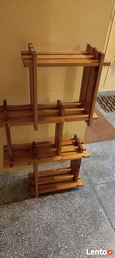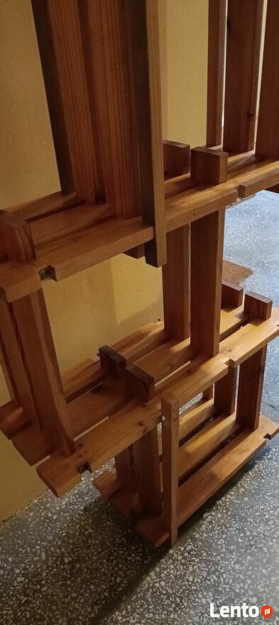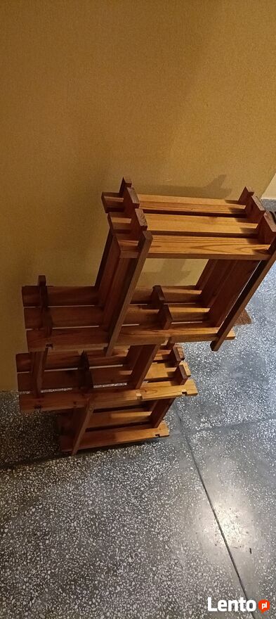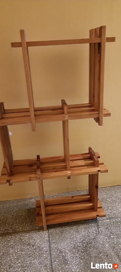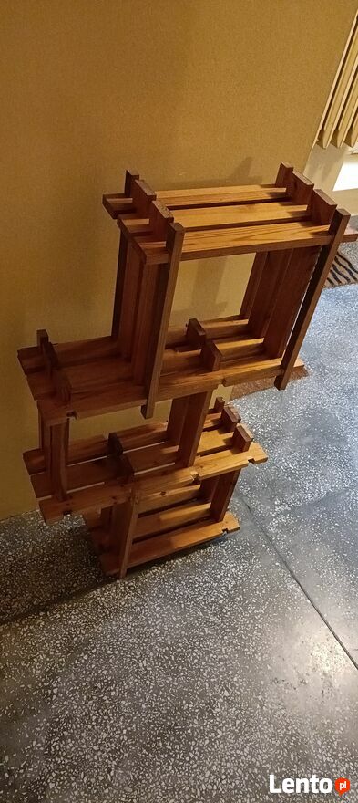 Drewniany, stylowy regał na kwiaty lub inne dekoracje. Wykonany z wysokiej jakości drewna, posiada kilka półek, które pozwalają na efektywne wykorzystanie przestrzeni. Idealny do domu lub ogrodu, nadaje się do przechowywania roślin, doniczek lub innych przedmiotów. Prosty i elegancki design pasuje do różnych aranżacji wnętrz.Używany ,delikatnie do odświeżenia wykonany z drewnianych listewek . Z tyłu są zaczepy dzięki czemu można przymocować do ściany