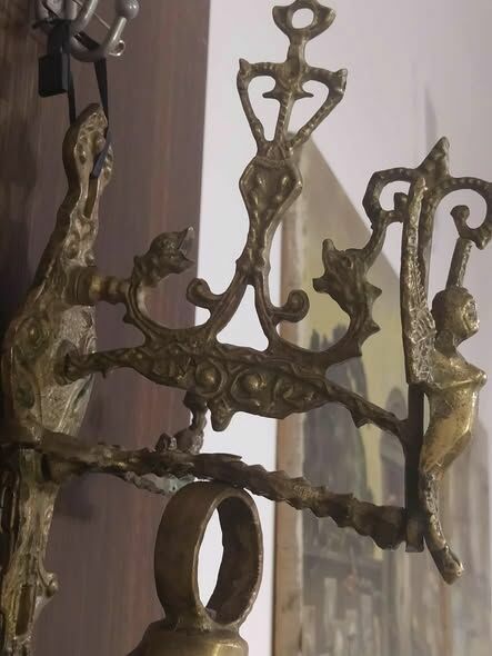 Dzwon został wykonany z bogato zdobionego grubego jasnego mosiądzu