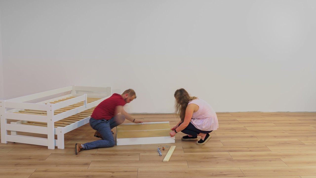 Drabinka posiada płaskie i wygodne szczebelki, można ją zamontować z prawej lub lewej strony. Dodatkowo łóżko FAMILY można wyposażyć w dwie małe szuflady, bądź jedną szufladę dzieloną w środku. Istnieje również możliwość montażu szuflady z funkcją spania, dzięki której zyskasz dodatkowe miejsce dla najmłodszych gości.
