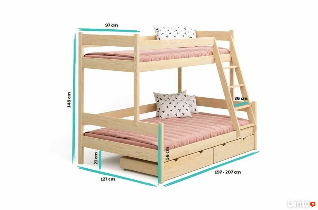 Drewniane łóżko które zapewni spokojny sen nawet trójce Waszych pociech. Wykorzystamy je również kiedy nie chcemy lub nie mamy możliwości przeniesienia łóżka dziecka do drugiego pokoju. Rodzice wyśpią się wygodnie na dolnym szerokim łóżku, natomiast dziecko będzie spało na górze. Duża ilość miejsca daje też duże pole do kreatywnej zabawy.