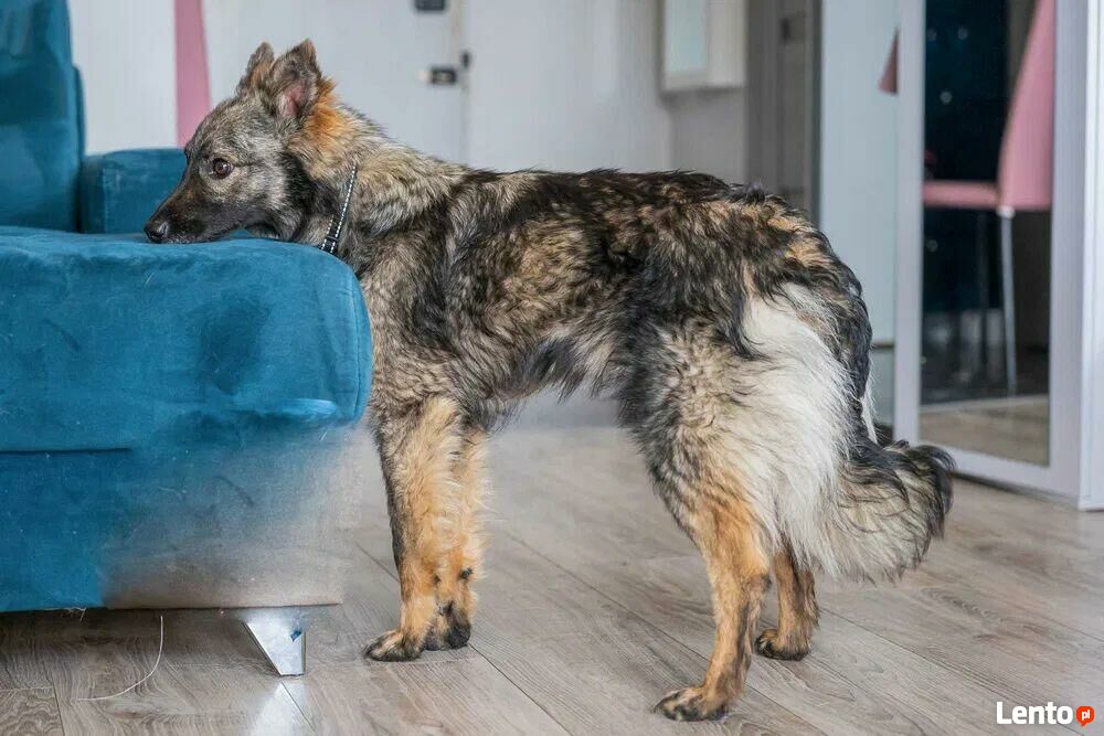 Pimpek ma około 1-1,5 roku i waży raptem 8 kilo. Jest puchaty i sarenkowaty, sięga do połowy łydki.
