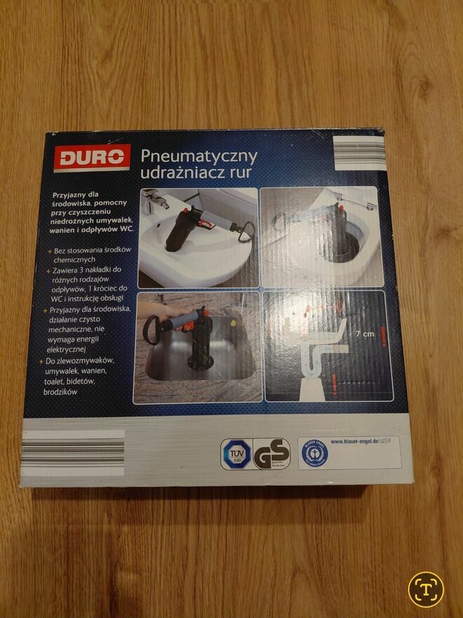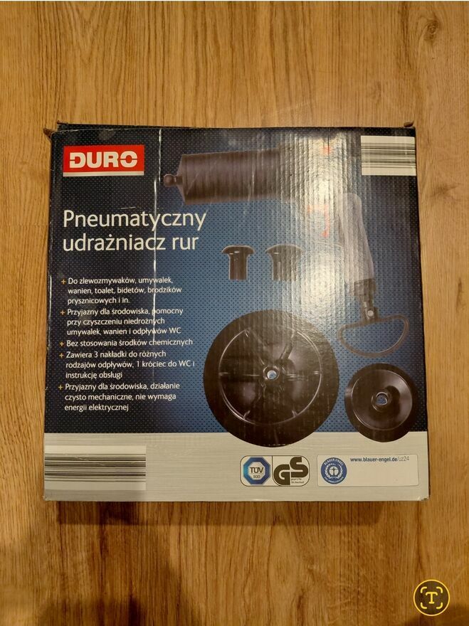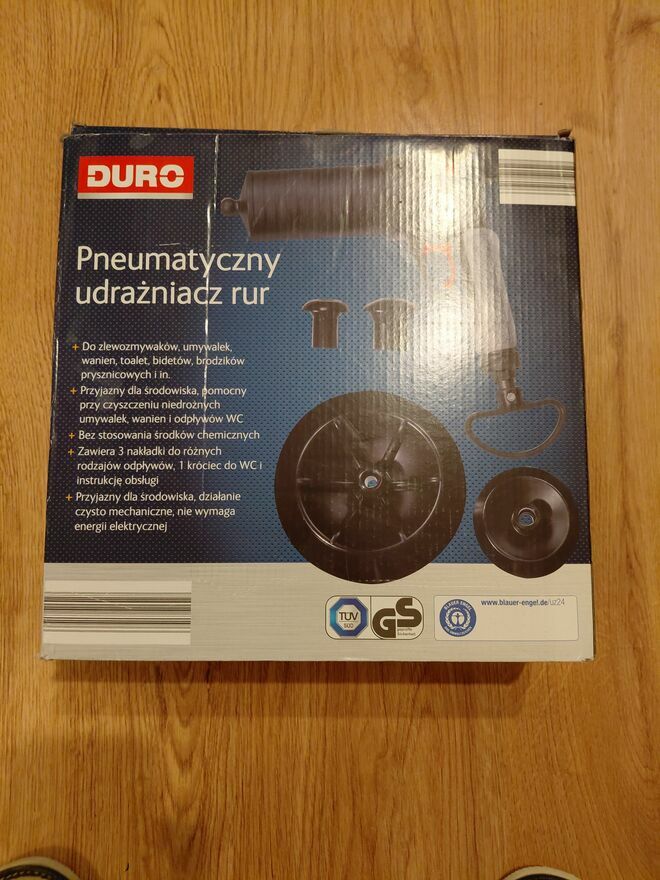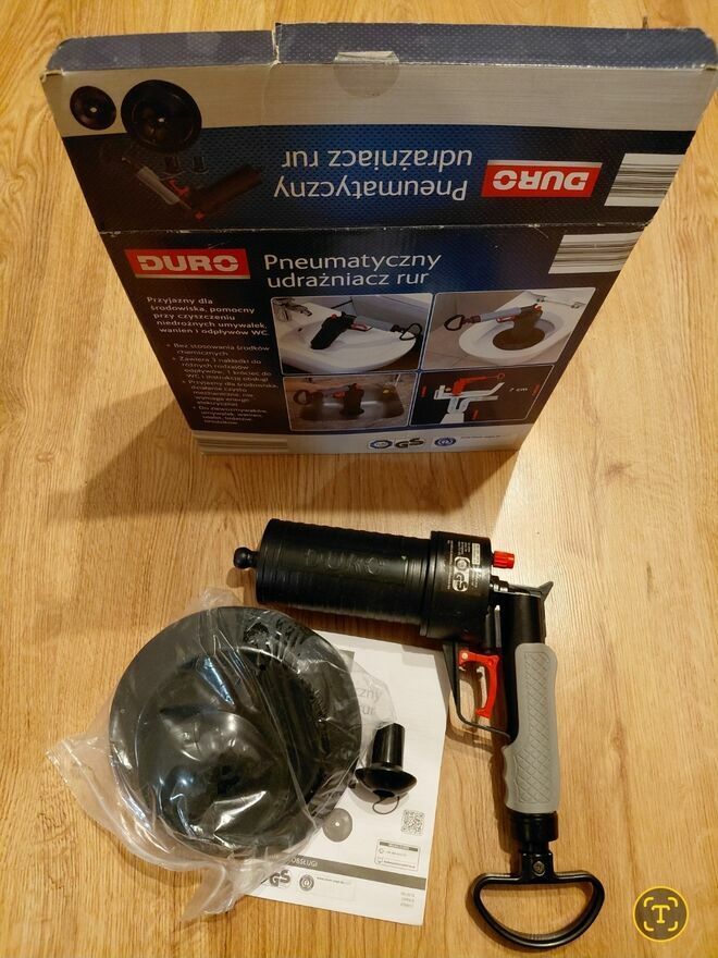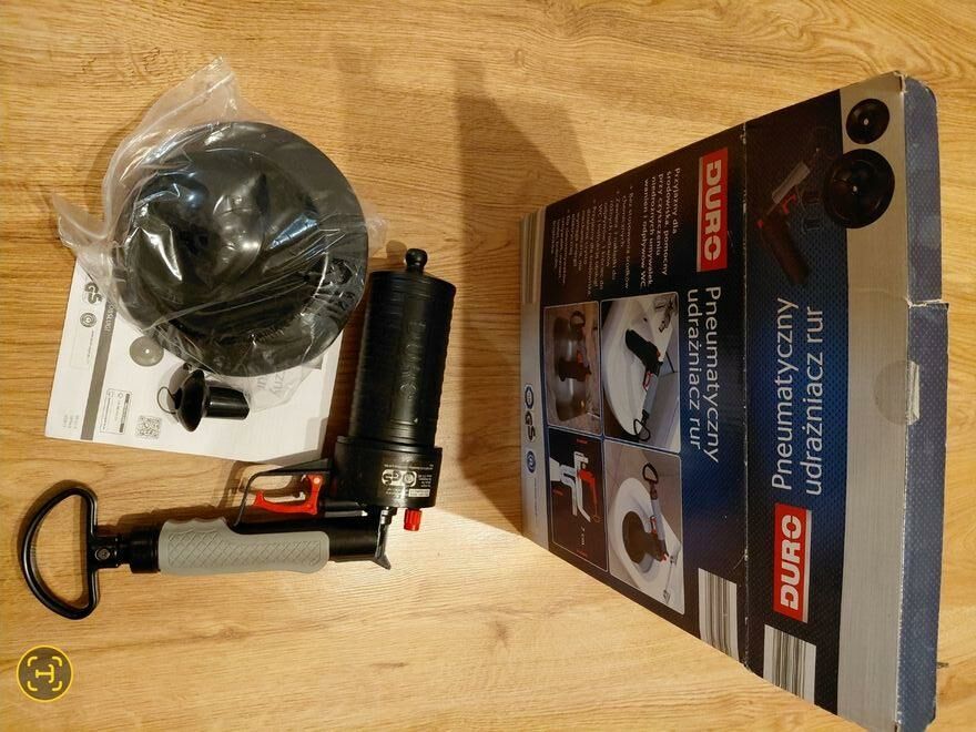 Pneumatyczny udrażniacz rur DURO,jak nowy, kompletny zestaw.Sprzedam pneumatyczny udrażniacz rur DURO. Urządzenie jest w świetnym stanie, użyte dosłownie kilka razy. Idealne do udrażniania zlewów, umywalek, wanien, kabin prysznicowych, toalet, bidetów i innych odpływów.