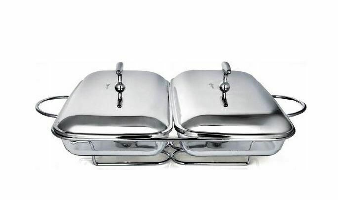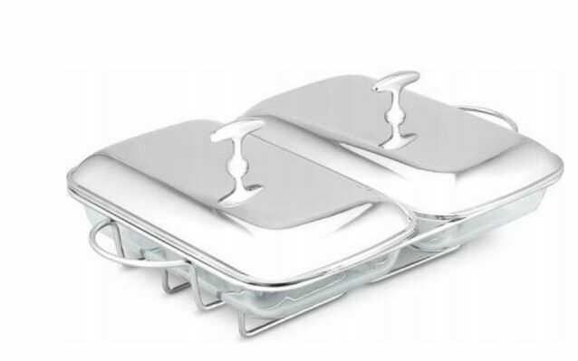 Półmiski wykonane ze szkła hartowanego i stelaż podgrzewacza do żywności ze stali nierdzewnej.